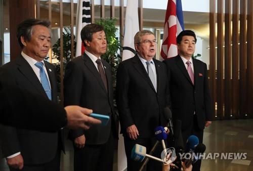 | ▲ 남북, IOC와 2032년 하계올림픽 유치 논의 토마스 바흐 IOC 위원장이 2019년 2월 15일(현지시간) 스위스 로잔 국제올림픽위원회(IOC) 본부에서 열린 남북 체육 수장들과의 3자 면담을 마친 뒤 브리핑을 하고 있다. 이들은 2020년 도쿄올림픽 남북 단일팀 구성과 2032년 하계올림픽 남북 공동 유치와 관련한 내용 등을 논의했다. 왼쪽부터 이기흥 대한체육회장, 도종환 당시 문화체육부 장관, 바흐 위원장, 김일국 당시 북한 체육상. [연합뉴스 자료사진] |