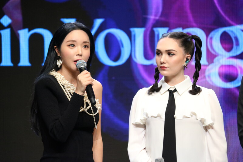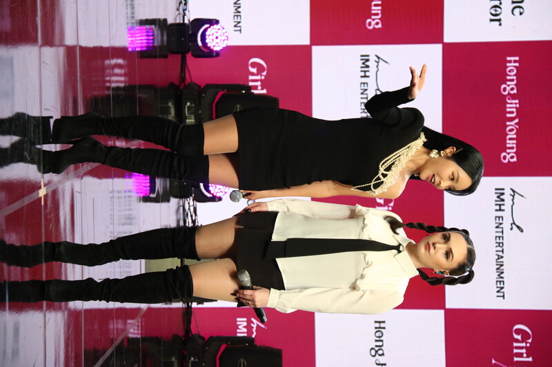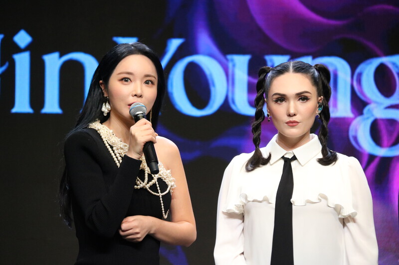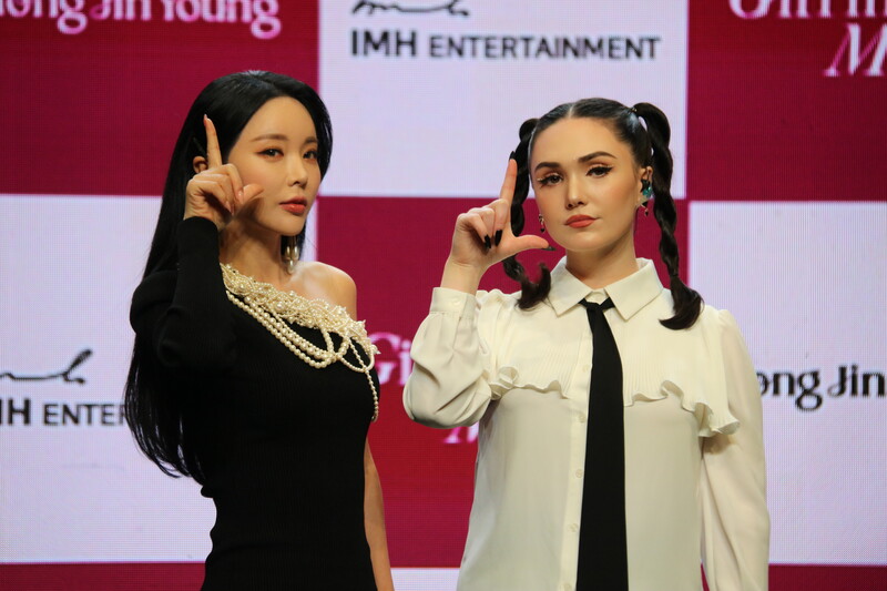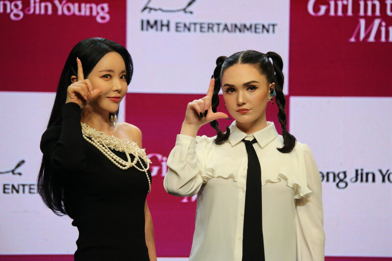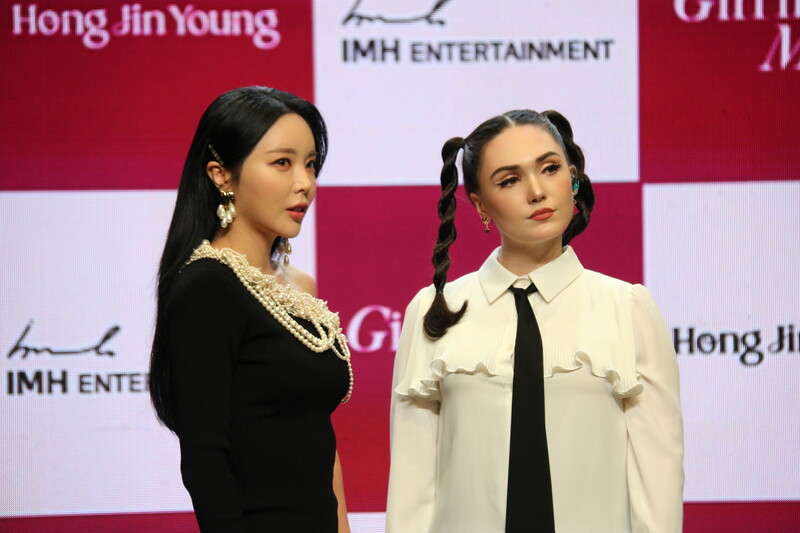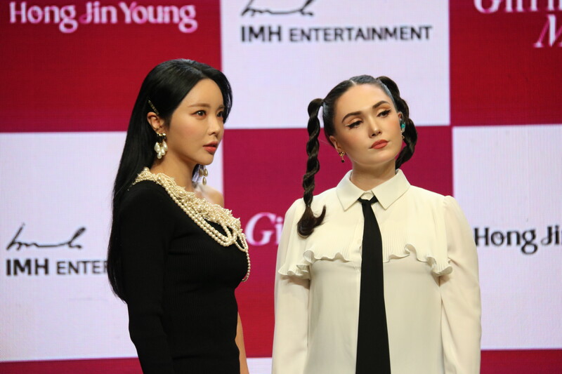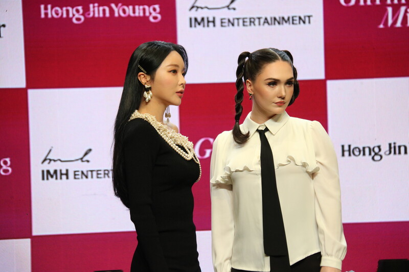 These photos, taken during the media showcase of South Korean artist Hong Jin-young's mini album "Color Mood" show artist Hong Jin-young and Frawley posing for their individual and group photo and answering to questions.
