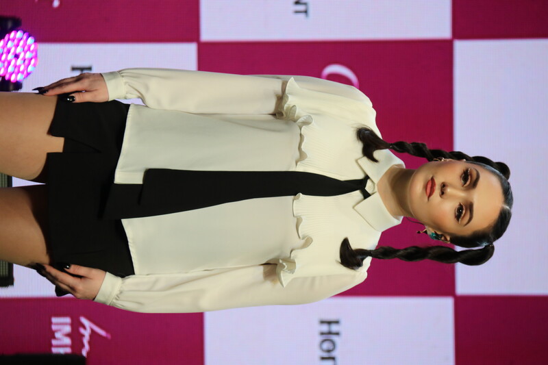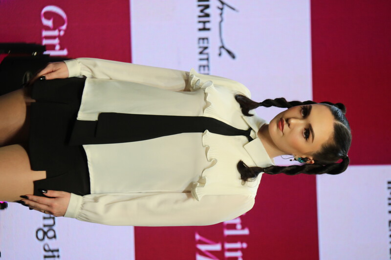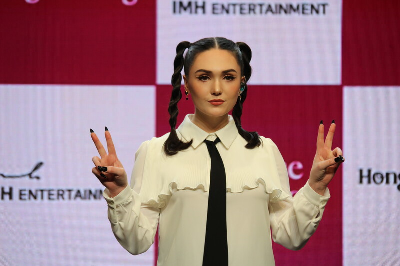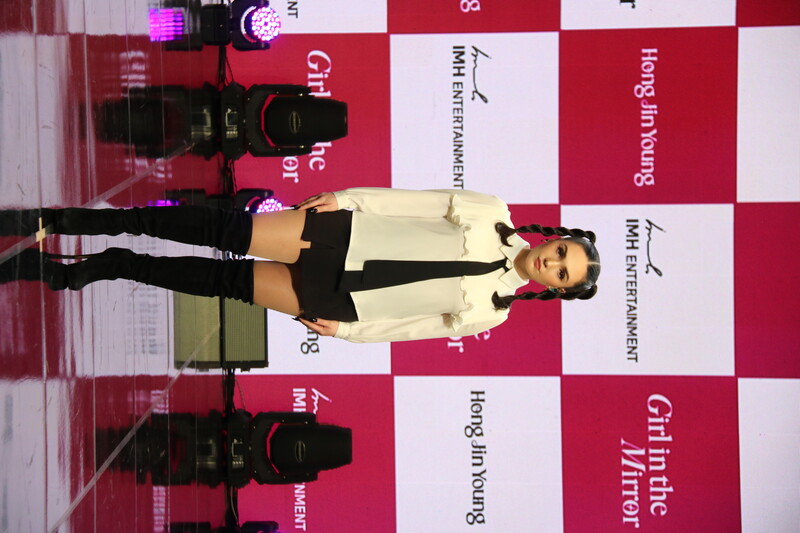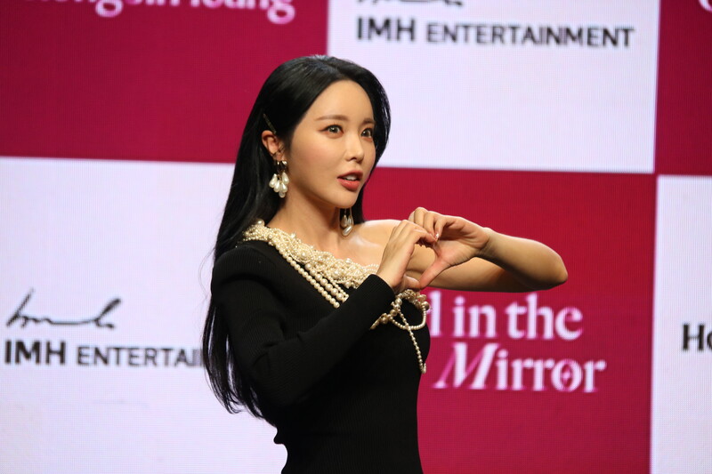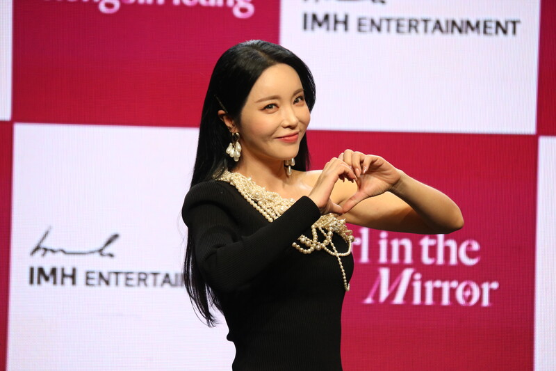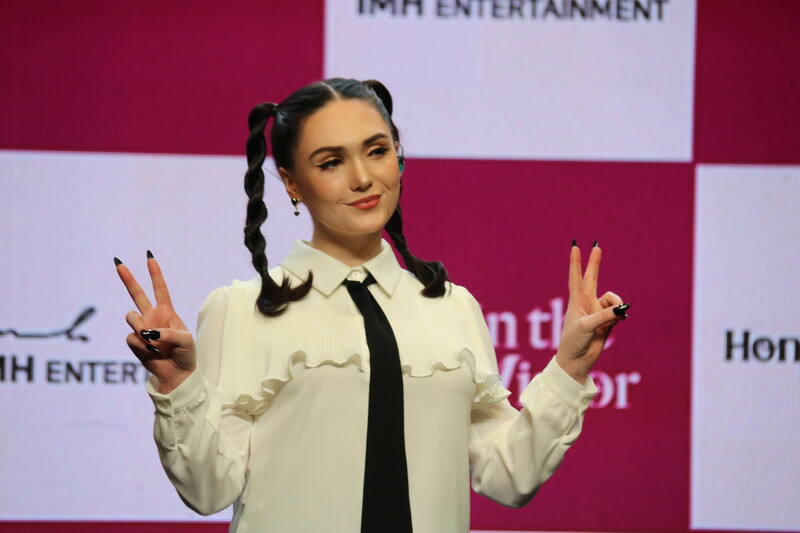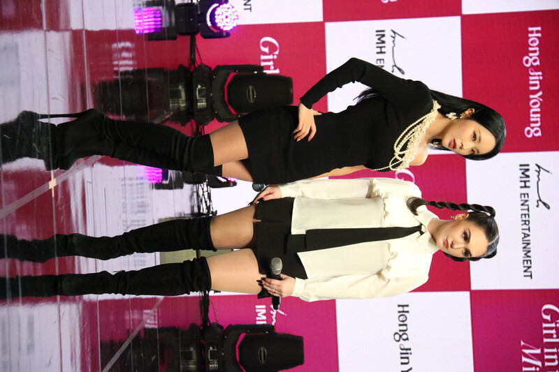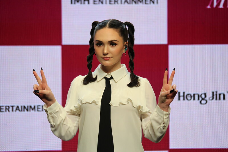 These photos, taken during the media showcase of South Korean artist Hong Jin-young's mini album "Color Mood" show artist Hong Jin-young and Frawley posing for their individual and group photo and answering to questions.