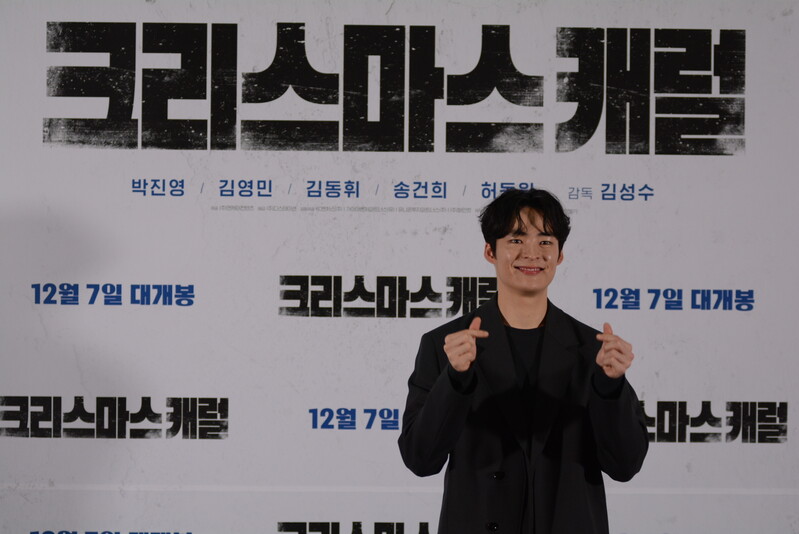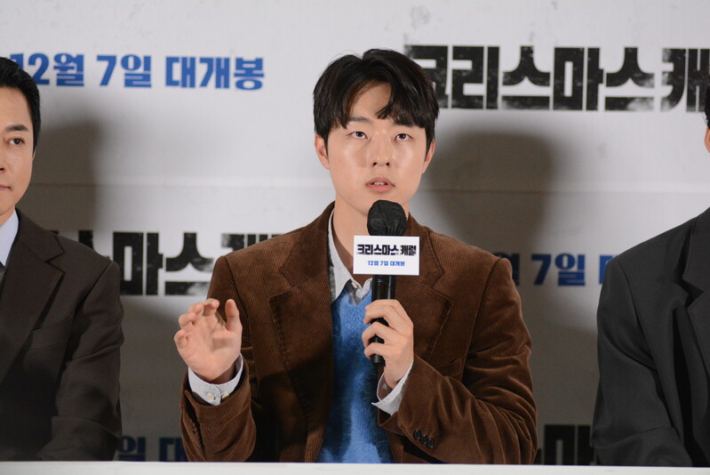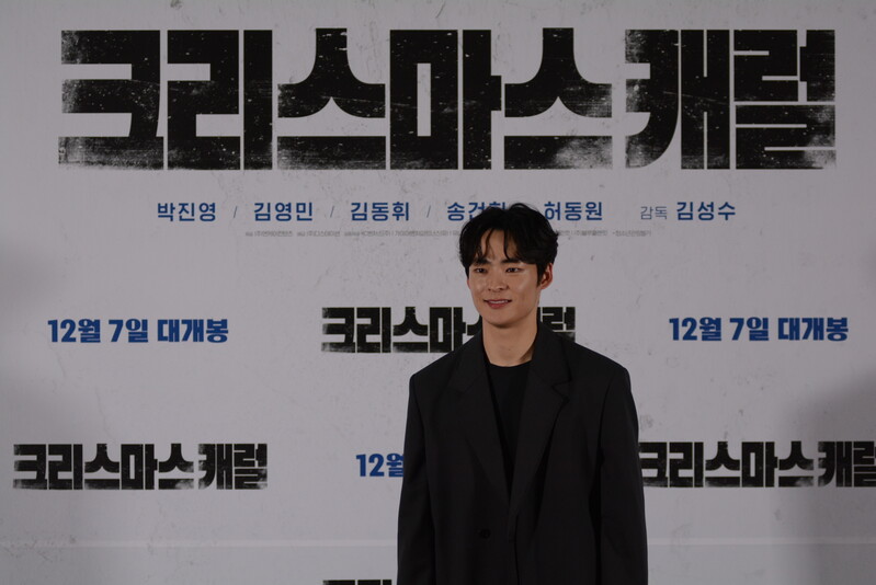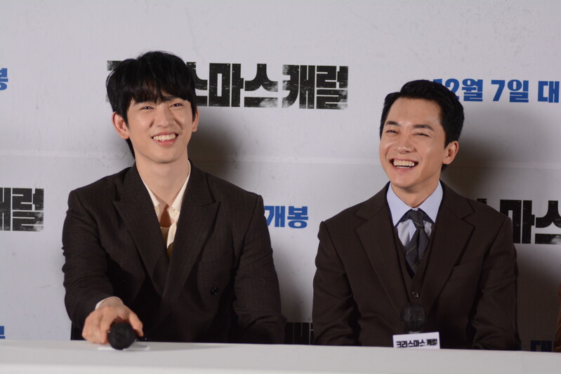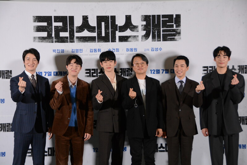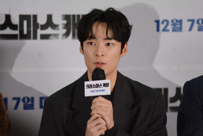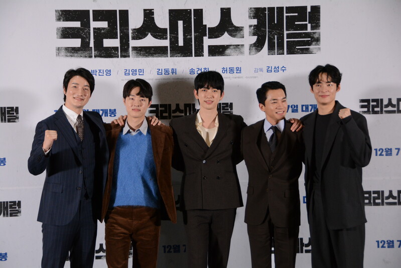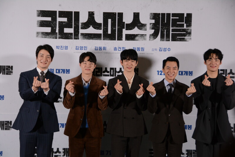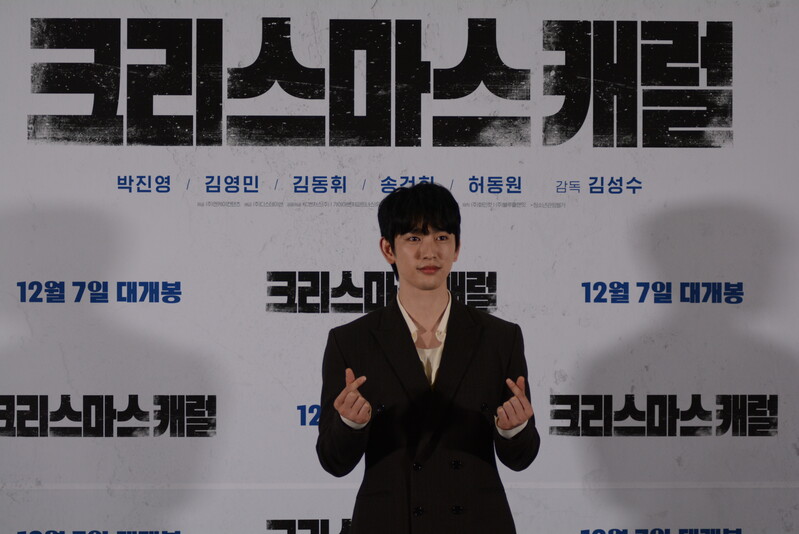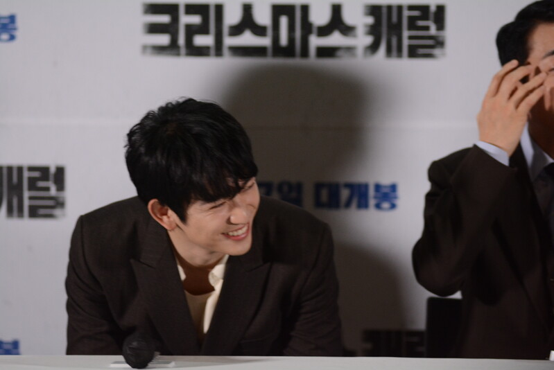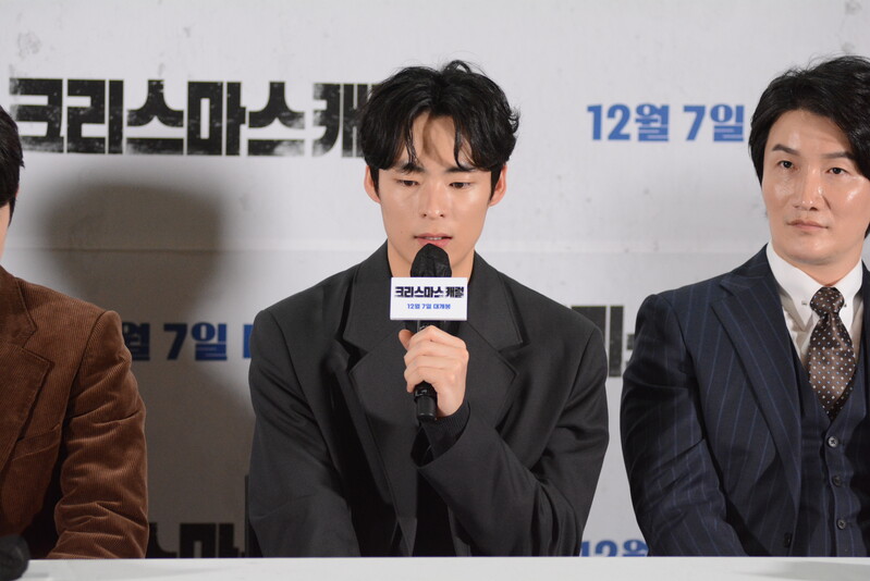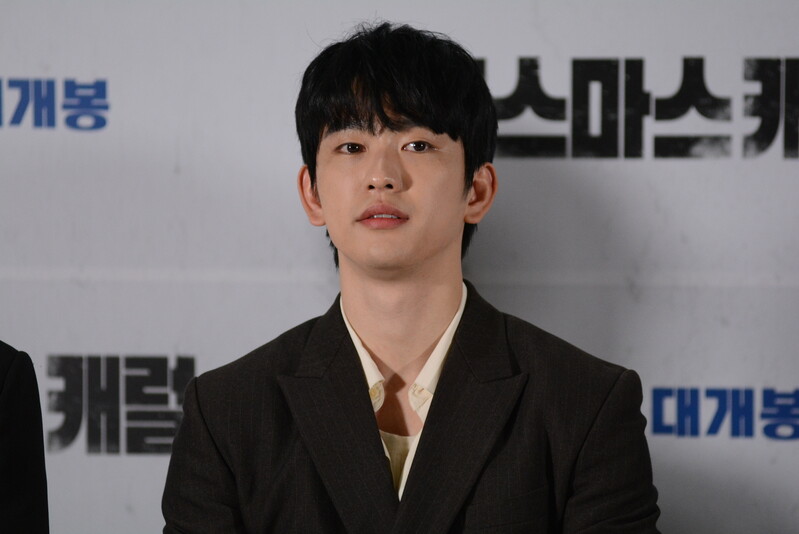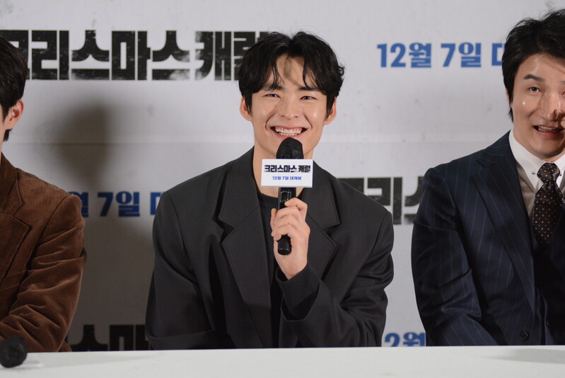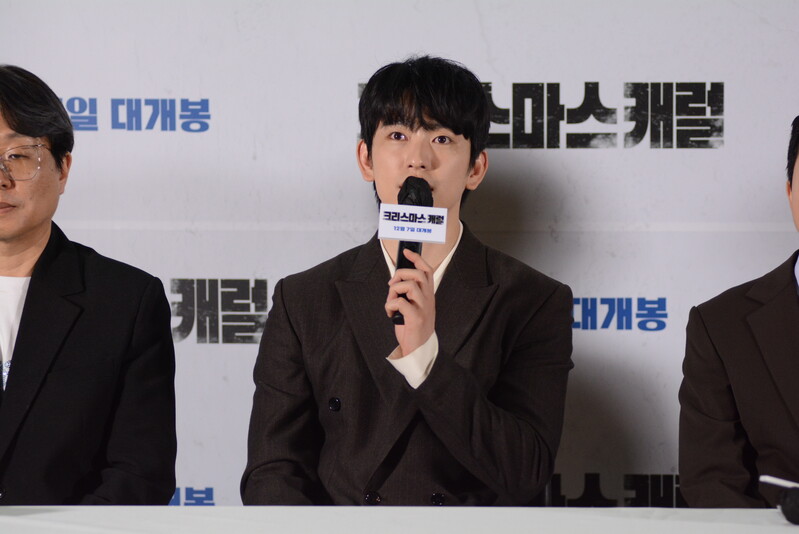 these photos taken from press conference of upcoming South Korean movie "Christmas Carol" show actor Jinyoung from K-pop boy group GOT7 and cast of the movie answering questions and posing for photos.