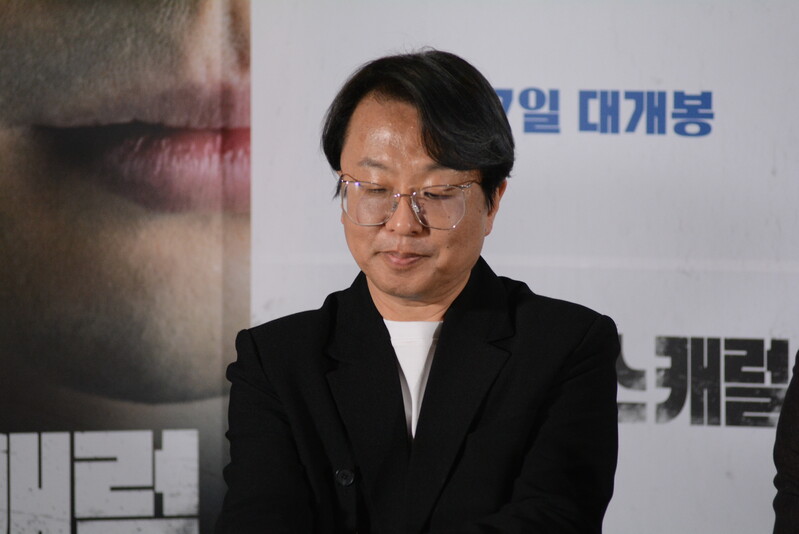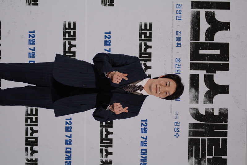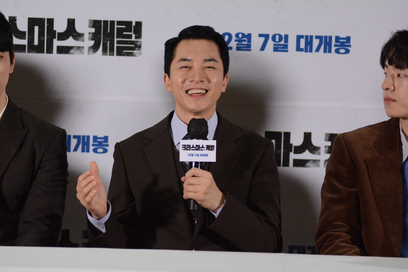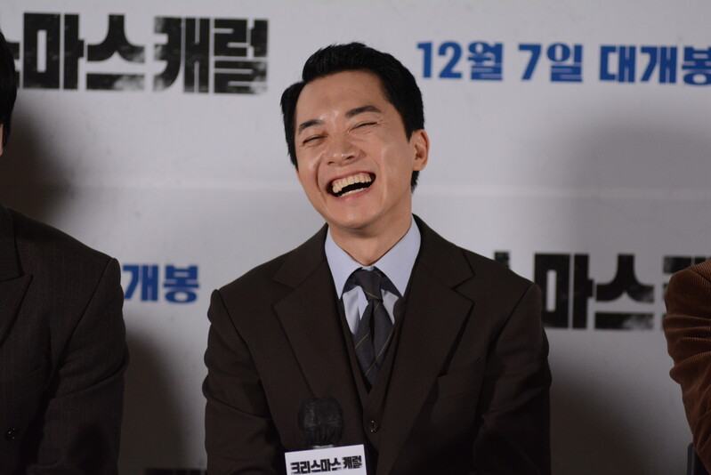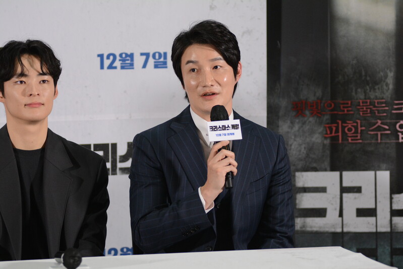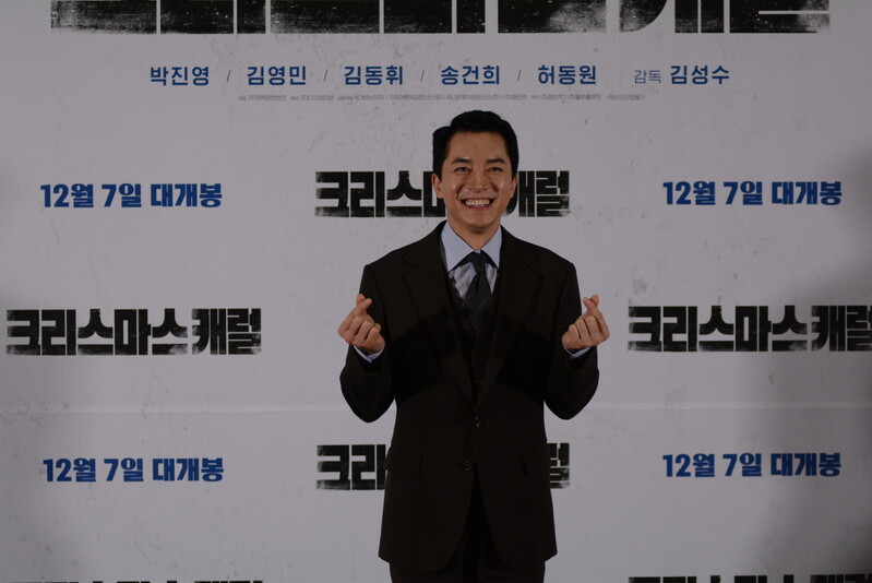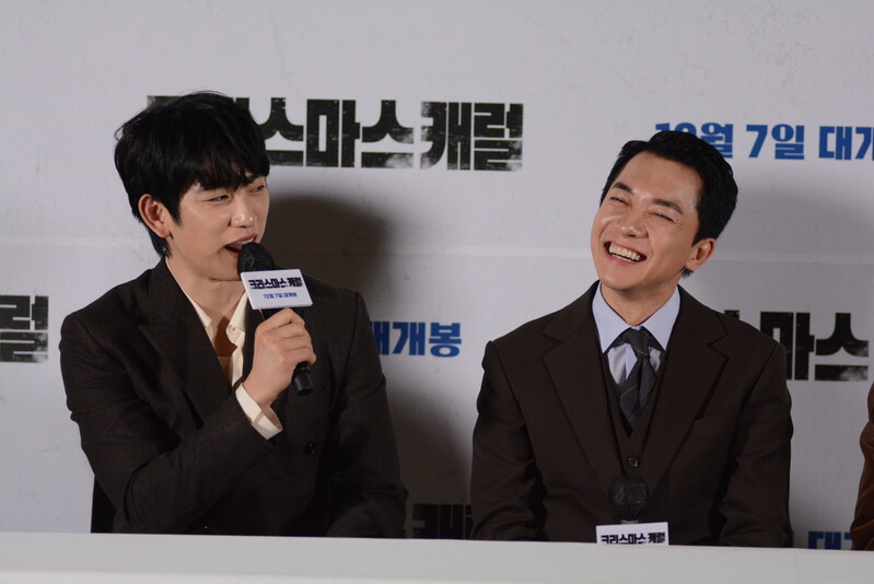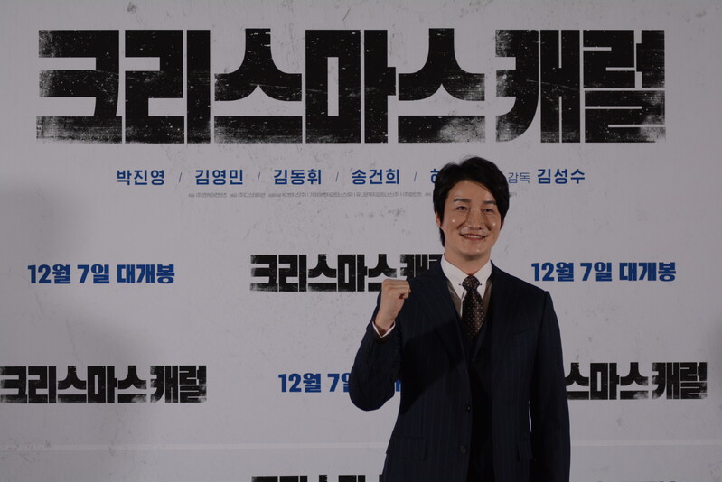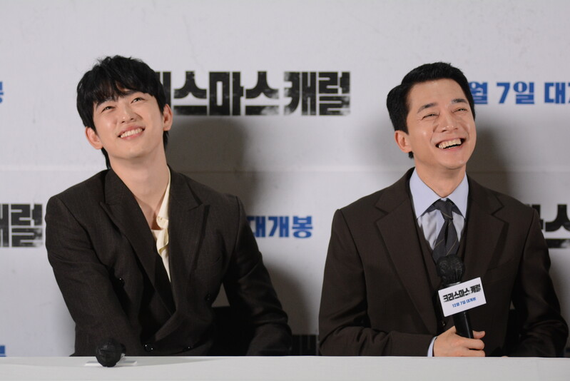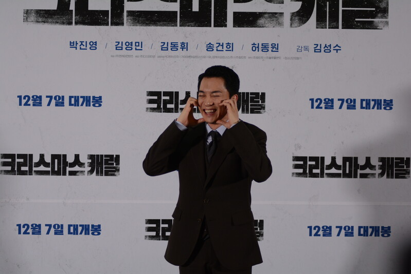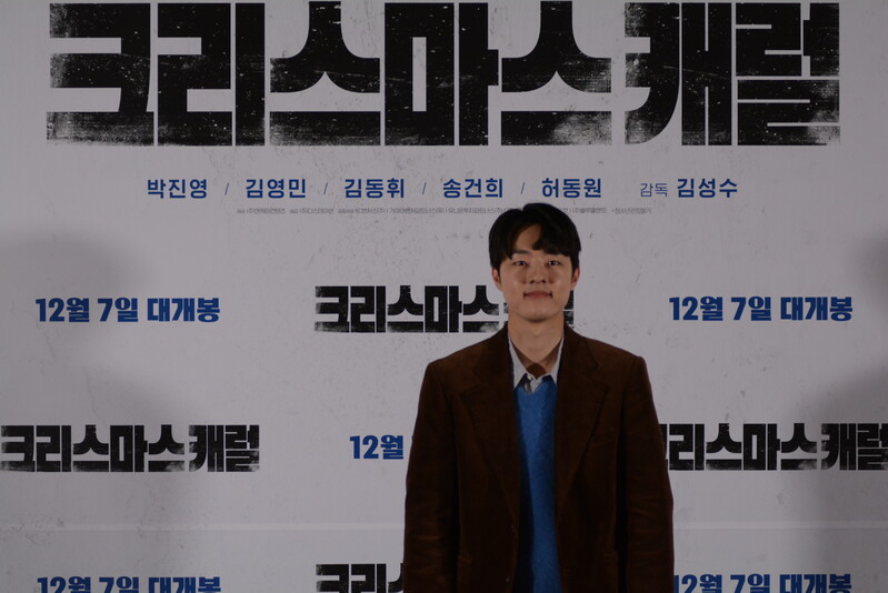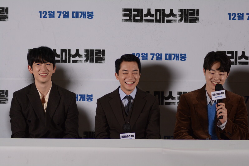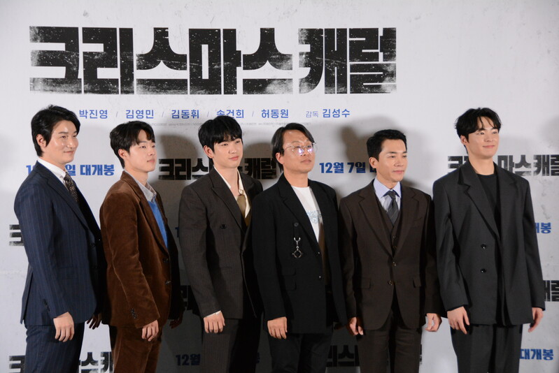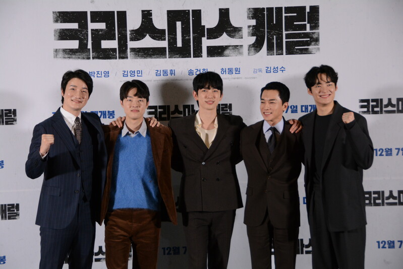 these photos taken from press conference of upcoming South Korean movie "Christmas Carol" show actor Jinyoung from K-pop boy group GOT7 and cast of the movie answering questions and posing for photos.