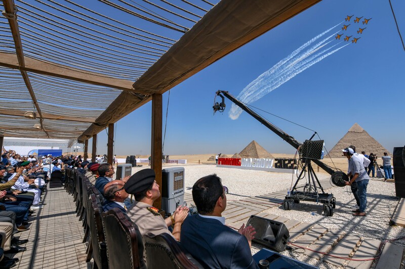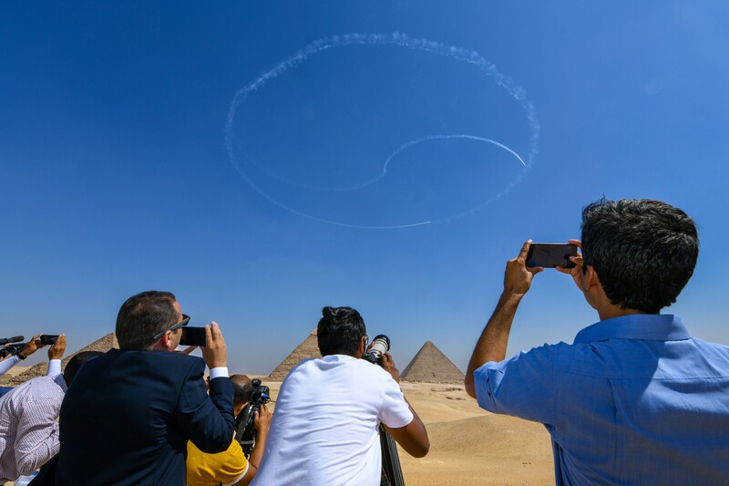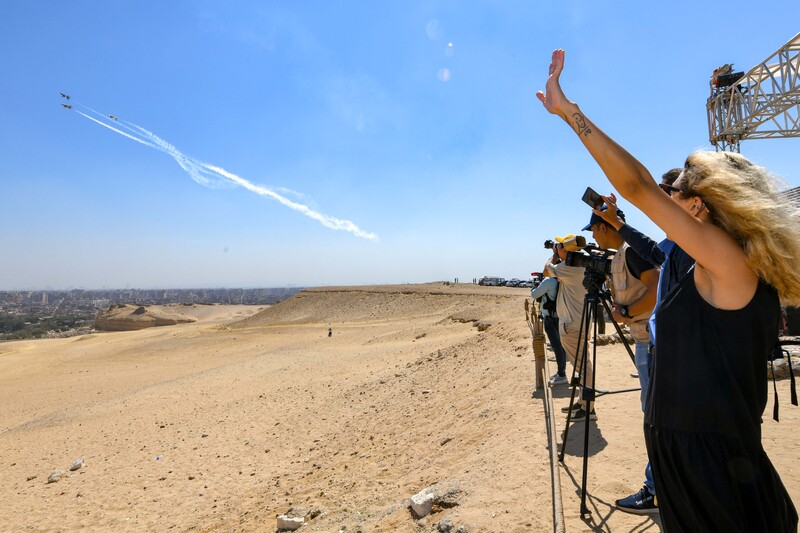 People are watching and taking photos of the South Korean aerobatic flight team, the Black Eagles, as they stage a performance during the Pyramid Air Show 2022 over the Giza Pyramids in Giza, Egypt, on Aug. 3, 2022. (Pool photo) (Yonhap)