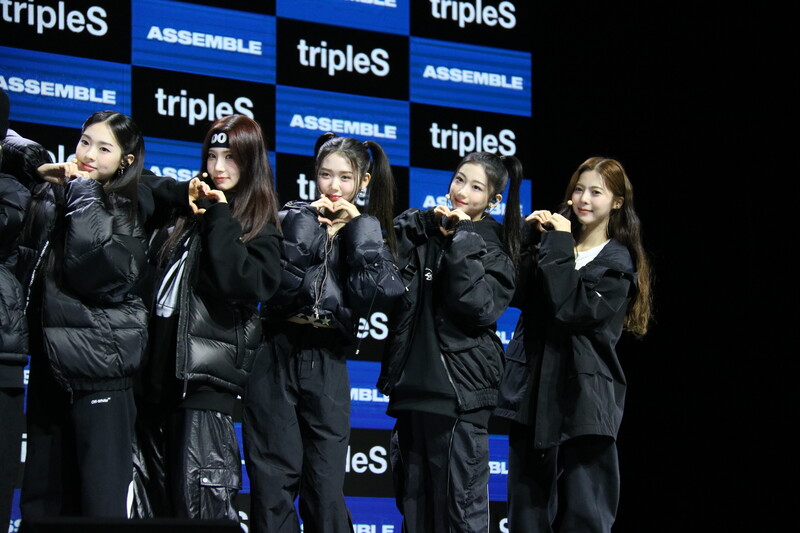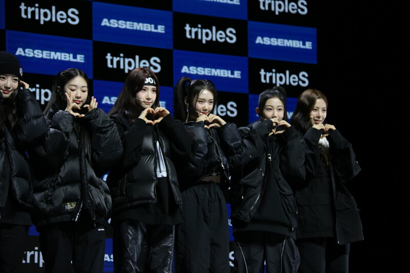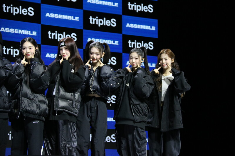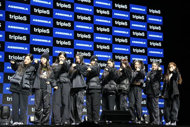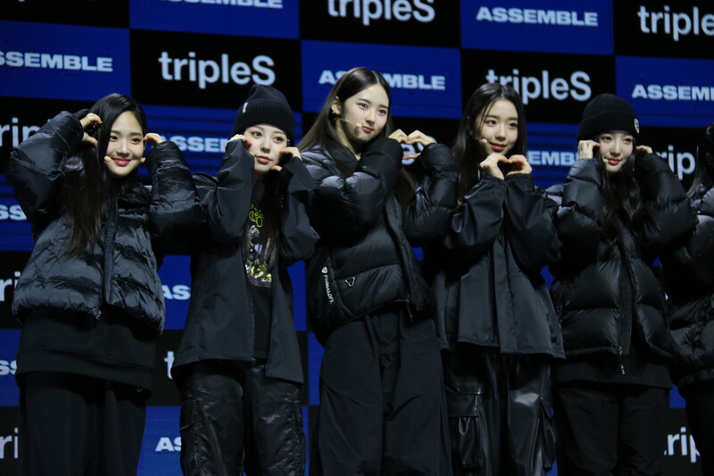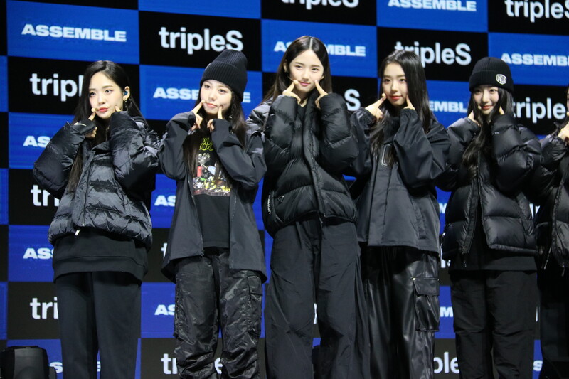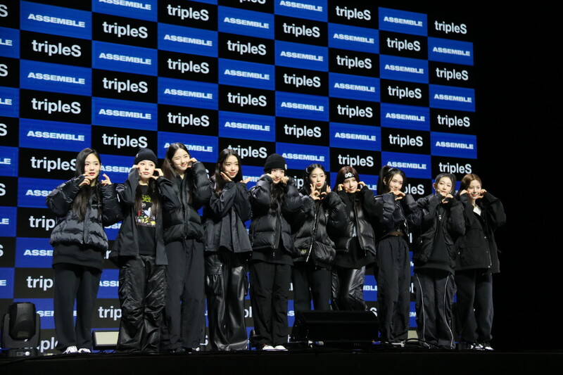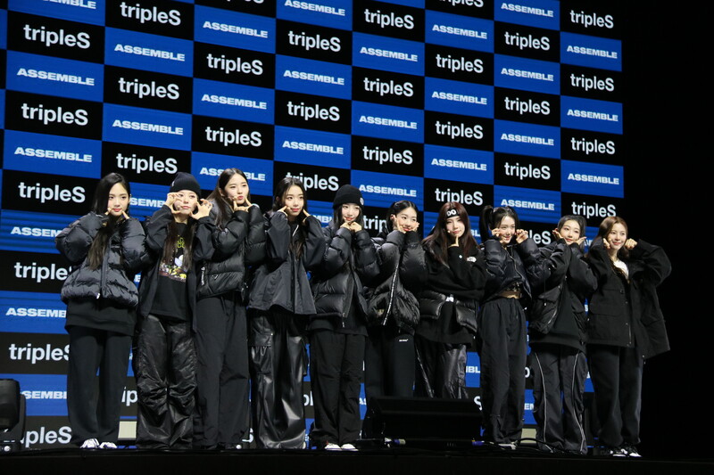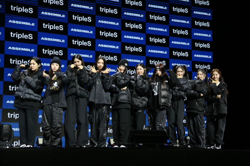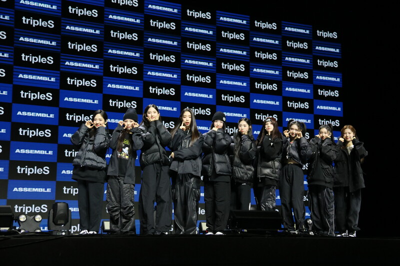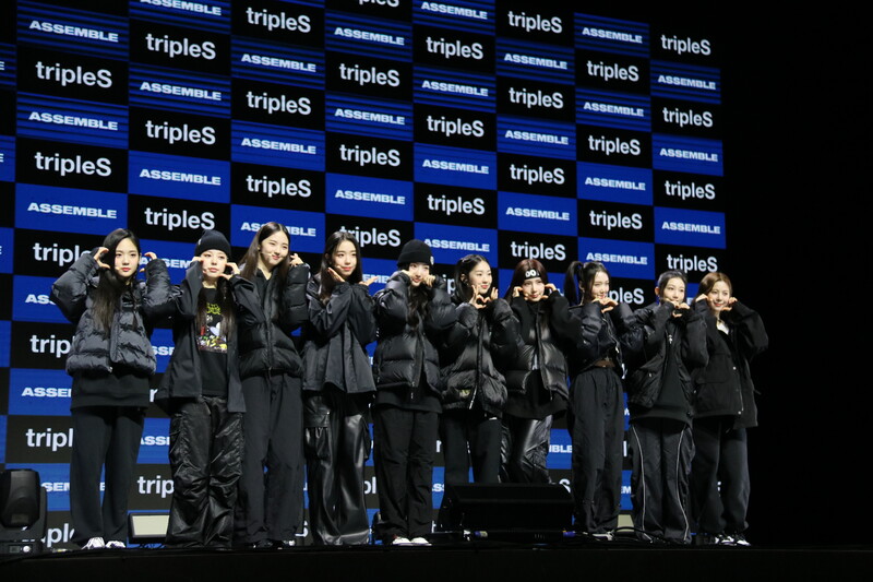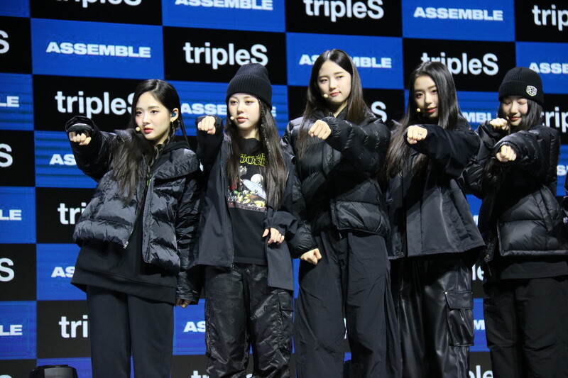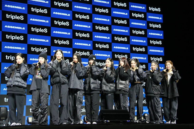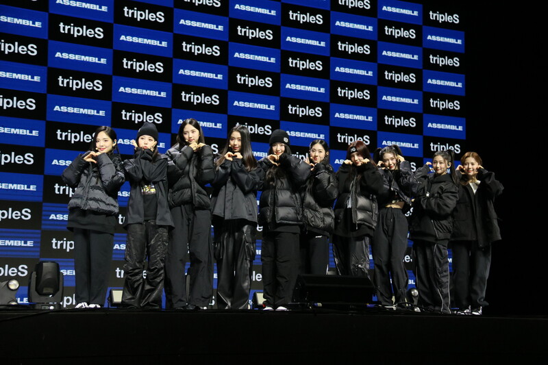 These photos show the 10 members of the South Korean girl group TripleS -- Yoon Seo-yeon, Jeong Hye-rin, Lee Ji-woo, Kim Chae-yeon, Kim Yoo-yeon, Kim Soo-min, Kim Na-kyoung, Gong Yu-bin, Kaede, and Seo Da-hyun -- at the press showcase of their first mini album 'ASSEMBLE,' which was held at the Blue Square Master Hall in Yongsang-gu, Seoul at Feb. 13.