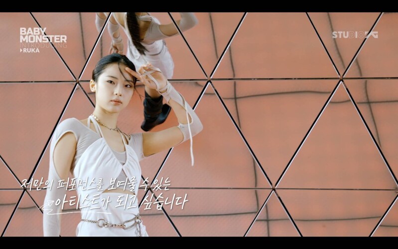 These photos, provided by YG Entertainment, show moments in the video introducing RUKA, member of YG's new girl group BABYMONSTER.