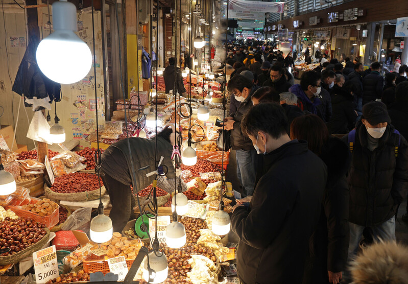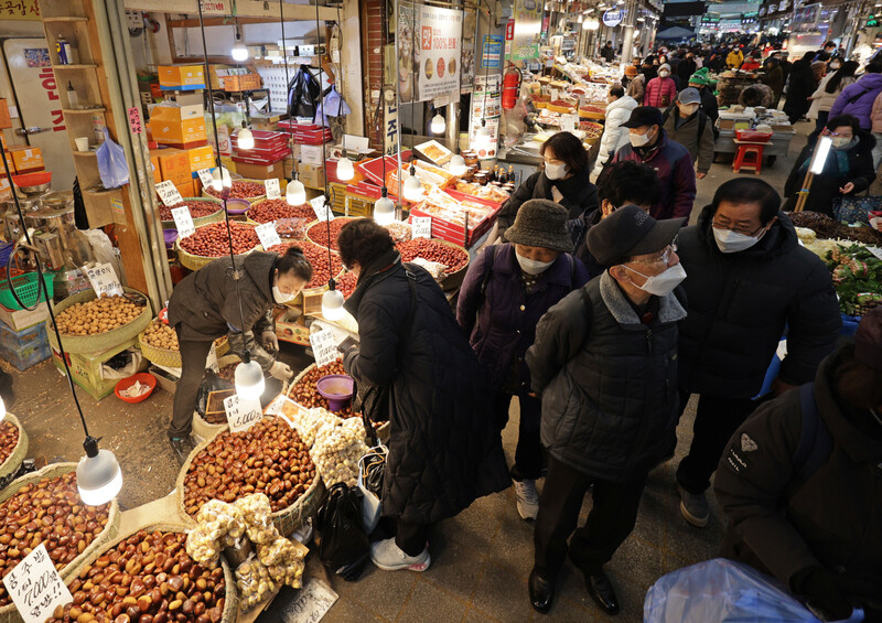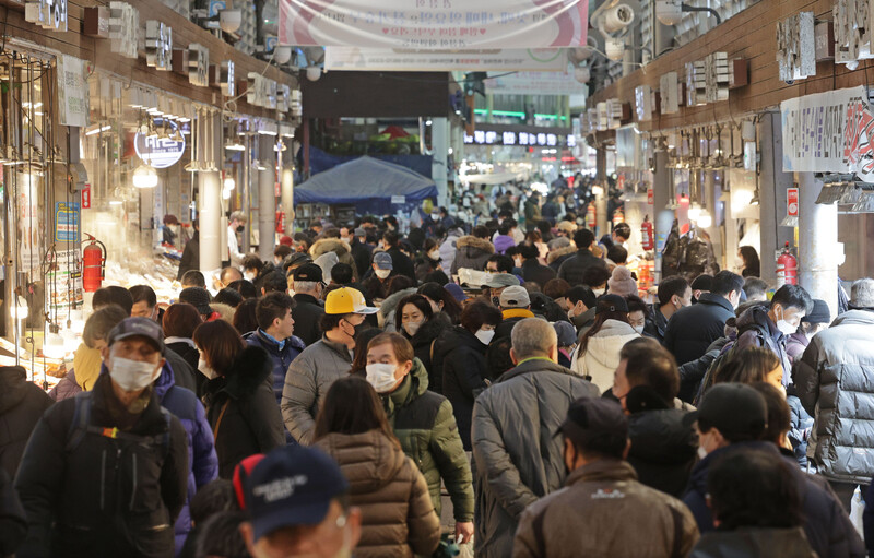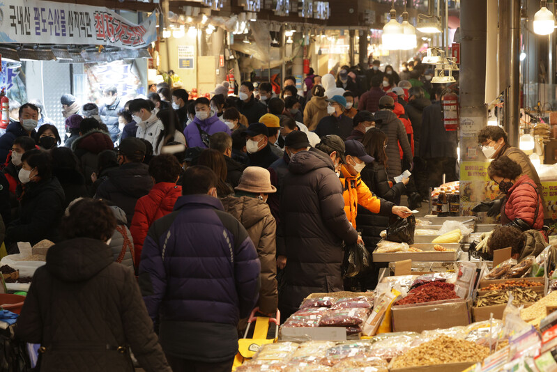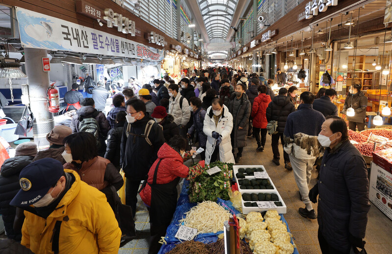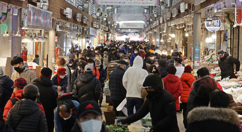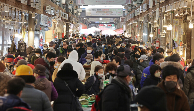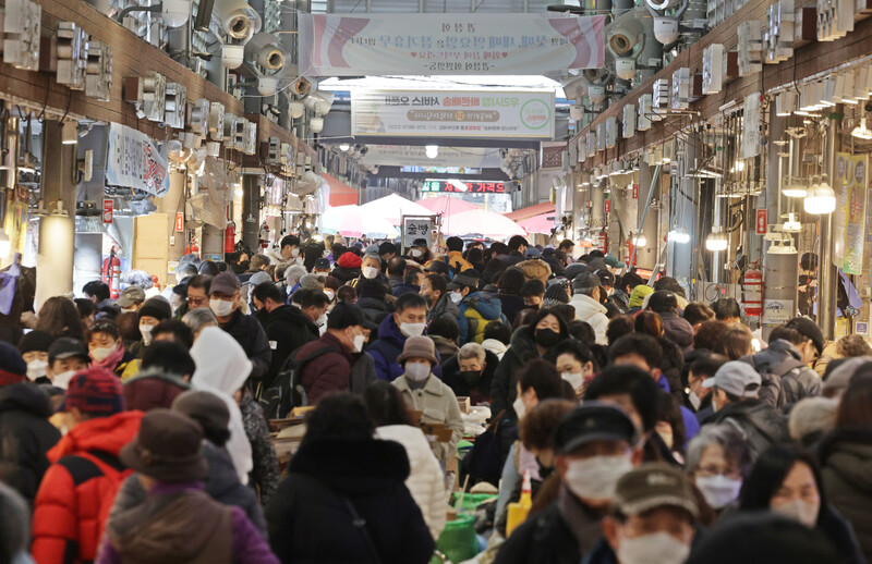 These photos, taken Jan. 8, 2023, show Cheongnyangni Market in Seoul packed with people, some two weeks ahead of this year's Lunar New Year holiday. (Yonhap)