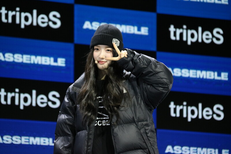 These photos show Kim Chae-yeon, Kim Yoo-yeon, and Kim Soo-min from the South Korean girl group TripleS at the press showcase of their first mini album 'ASSEMBLE,' which was held at the Blue Square Master Hall in Yongsang-gu, Seoul at Feb. 13.