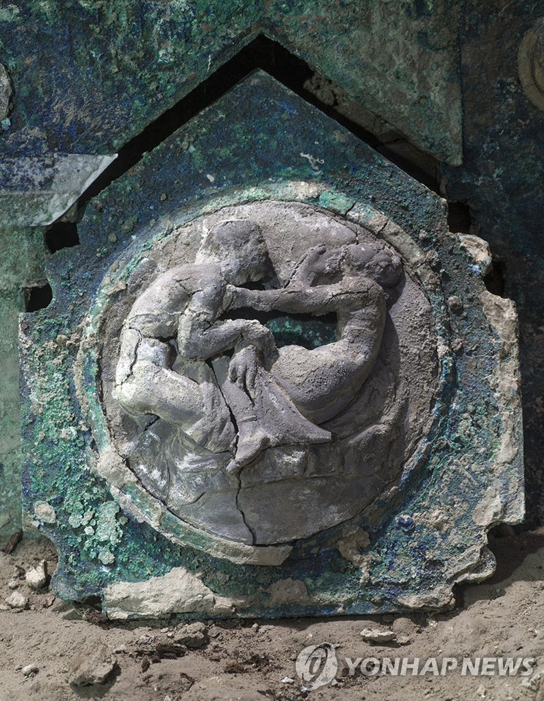 | ▲ 27일(현지시간) 세상에 공개된 고대 로마 시대 마차 옆면의 조각 장식. [AP=연합뉴스] |