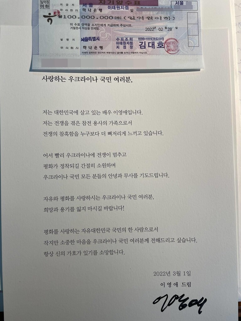 Dmytro Ponomarenko, the Ukrainian Ambassador to Korea, revealed the photo of a check of 100 million won and Lee’s letter, which were sent to the People of Ukraine, through Twitter on Mar. 1.