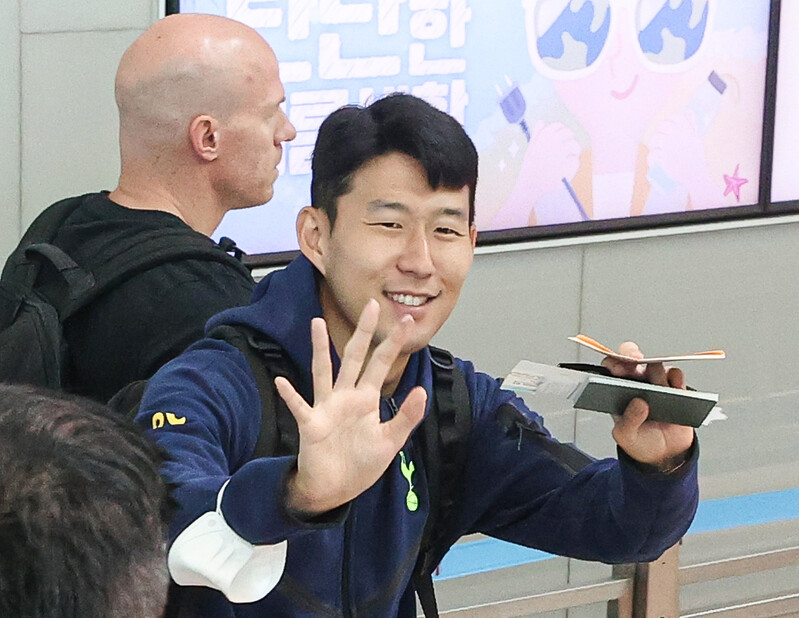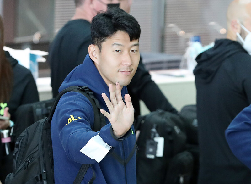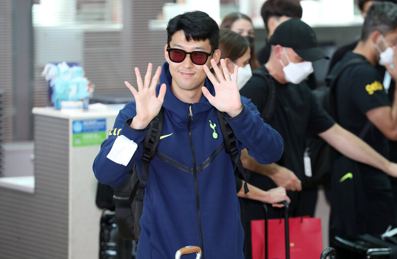Son Heung-min, a South Korean football star who plays forward for the Premier League club Tottenham Hotspur, waves to fans at Incheon International Airport, west of Seoul, before his departure for England on July 17, 2022. (Pool photo) (Yonhap)