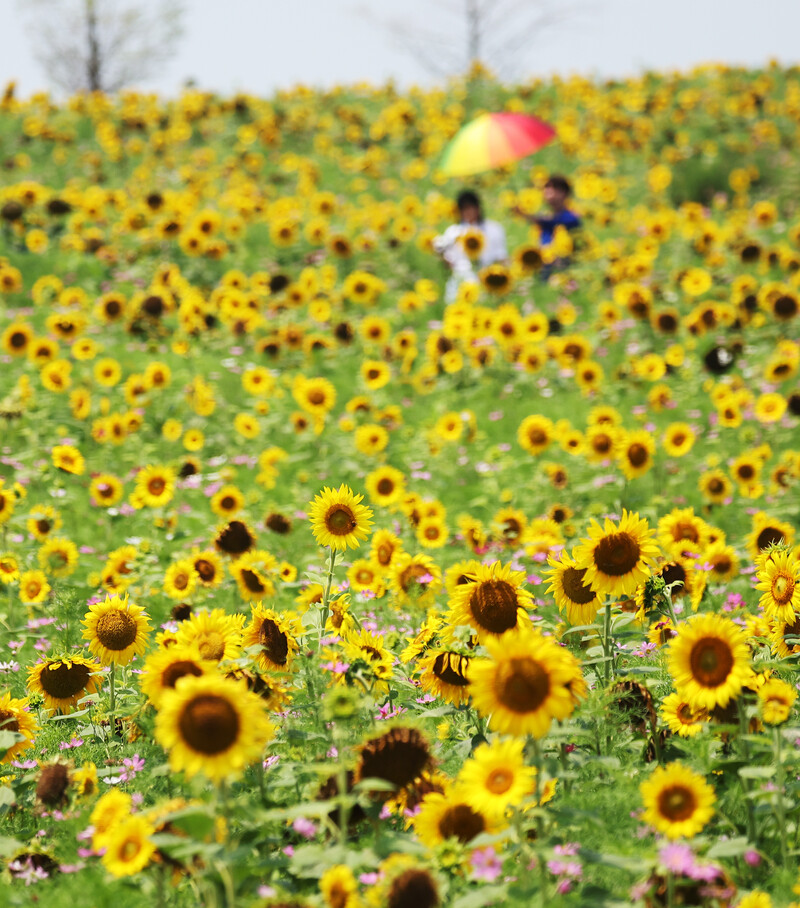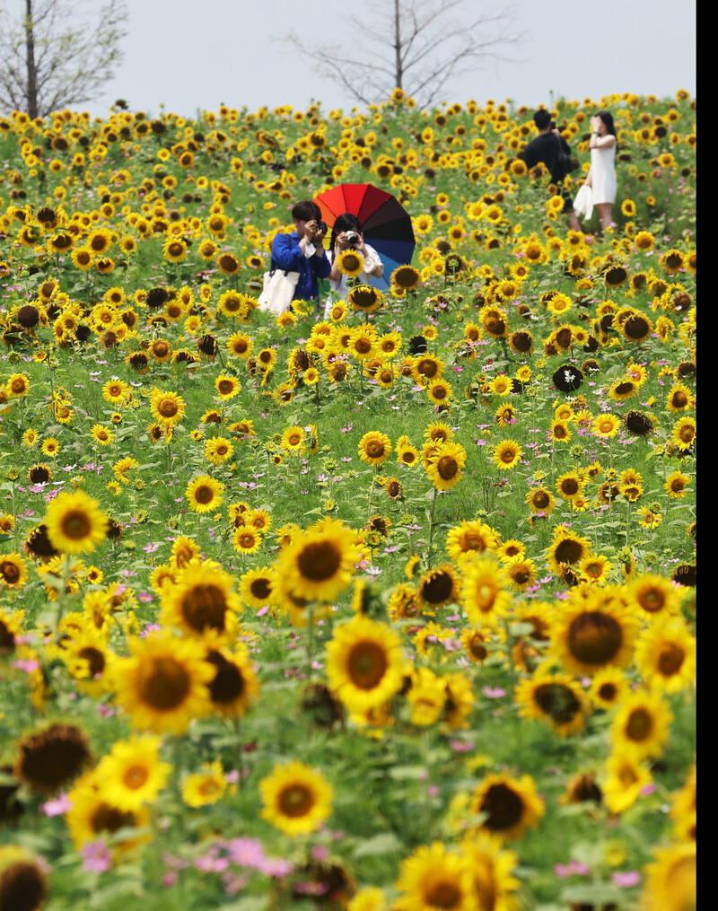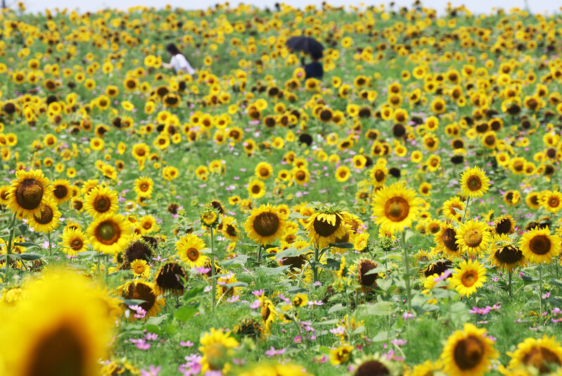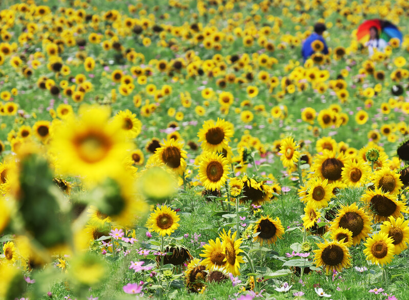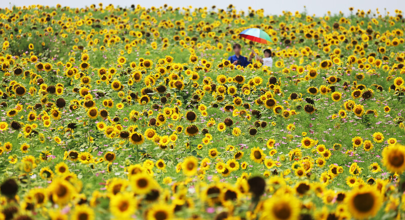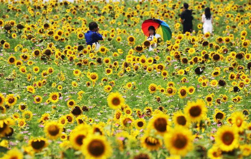 Visitors walk through a sunflower field in Anseong, Gyeonggi Province, amid scorching temperatures on July 3, 2022. (Yonhap)