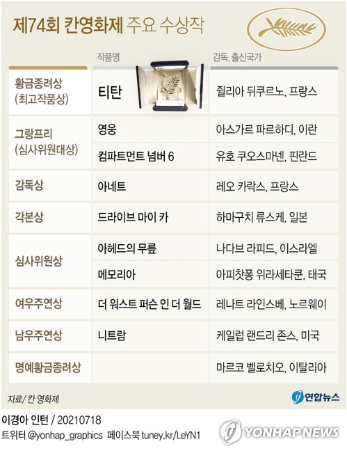 (서울=연합뉴스) 이재윤 기자 = 17일(현지시간) 프랑스 칸에서 열린 제74회 칸영화제 폐막식에서 쥘리아 뒤쿠르노(37) 감독의 연쇄살인마에 관한 영화 '티탄'이 최고 작품상인 황금종려상을 받았다. 프랑스 출신의 30대 뒤쿠르노 감독은 황금종려상을 받은 두 번째 여성 감독이 됐다.