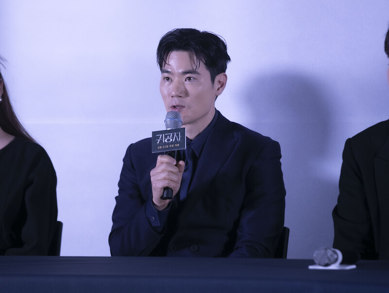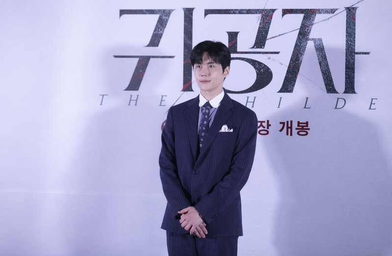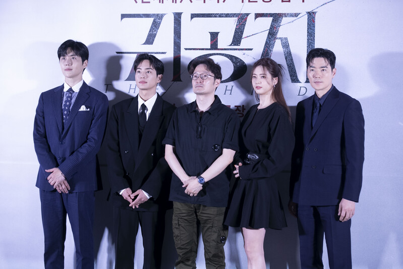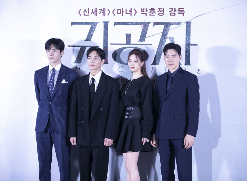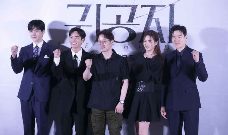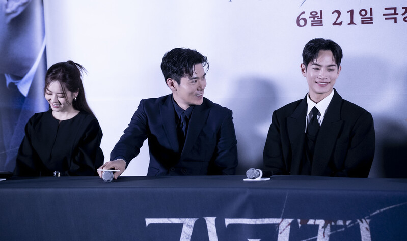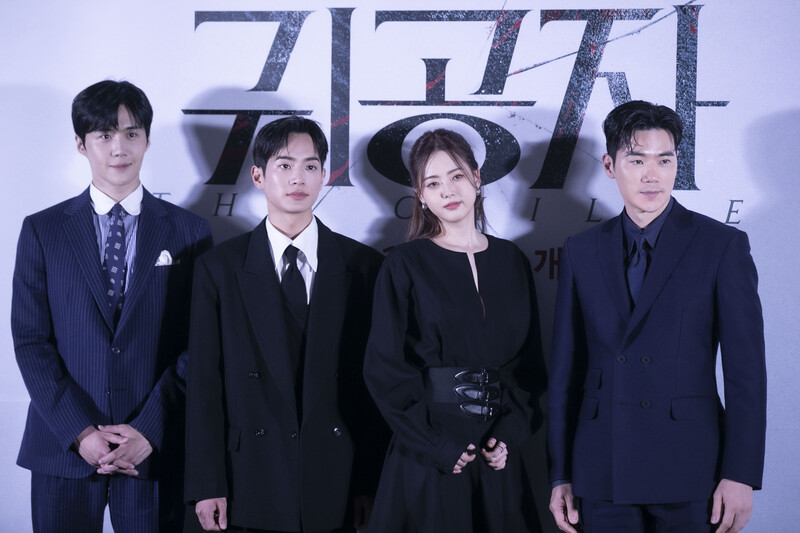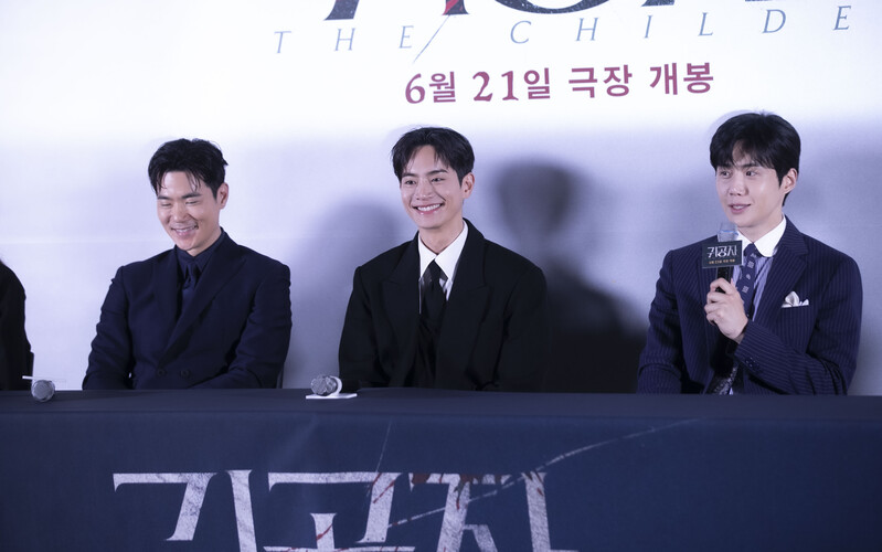 These photos taken during the press conference of the upcoming movie "The Childe" show members of the cast answering questions and posing for their individual and group photos.