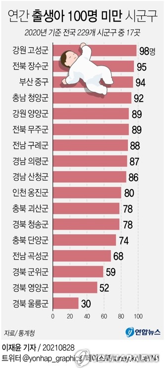 (서울=연합뉴스) 이재윤 기자 = 통계청이 최근 발표한 2020년 출생통계에 따르면 작년 전국 229개 시군구 가운데 출생아 100명 미만인 지방자치단체는 17곳으로 지난 2015년의 3곳과 비교해 5년새 14곳이나 증가했다.