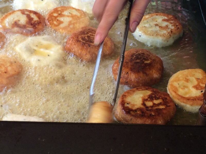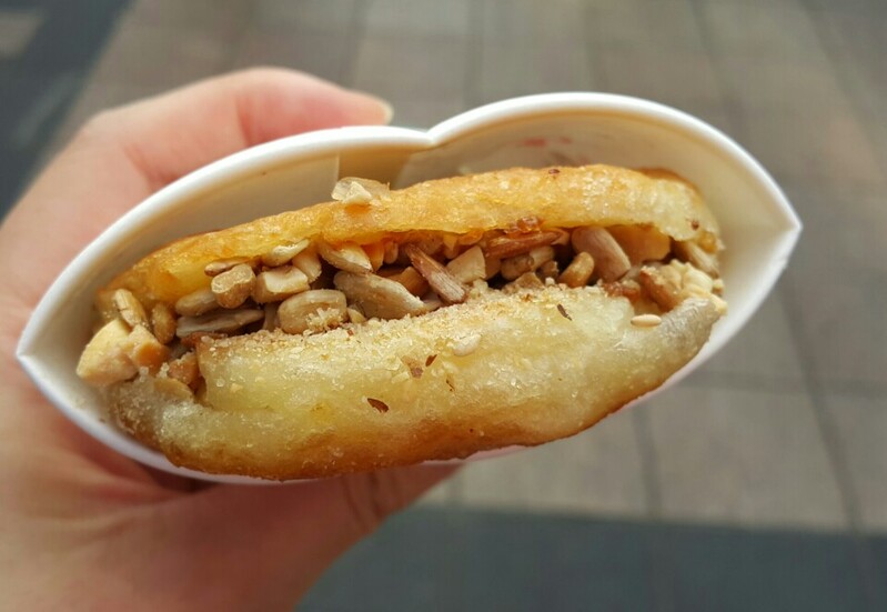 Hotteok is a popular snack that Koreans usually eat during winter, and it is a rice cake made with sugar in flour dough and fried in oil.