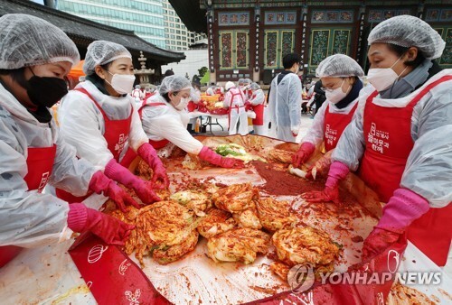 | ▲ This photo, taken on Dec. 2, 2021, shows people making kimchi at Jogyesa temple. (Yonhap) |