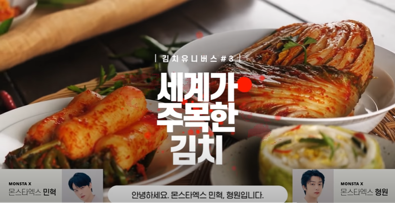 In the video, Monsta X's two members introduce the historical background of how kimchi officially became known to the world through the 1986 Asian Games and the 1988 Seoul Olympics, and the fact that Korea's kimchi culture was registered as an UNESCO Intangible Cultural Heritage of Humanity in 2013.
