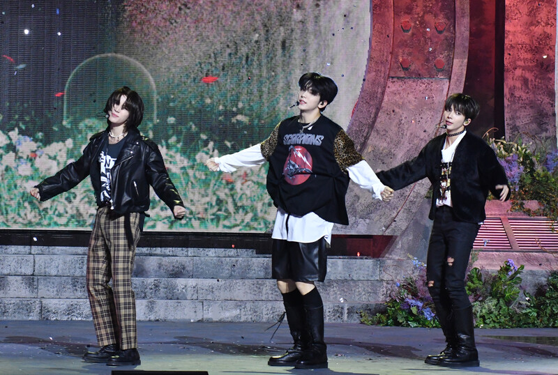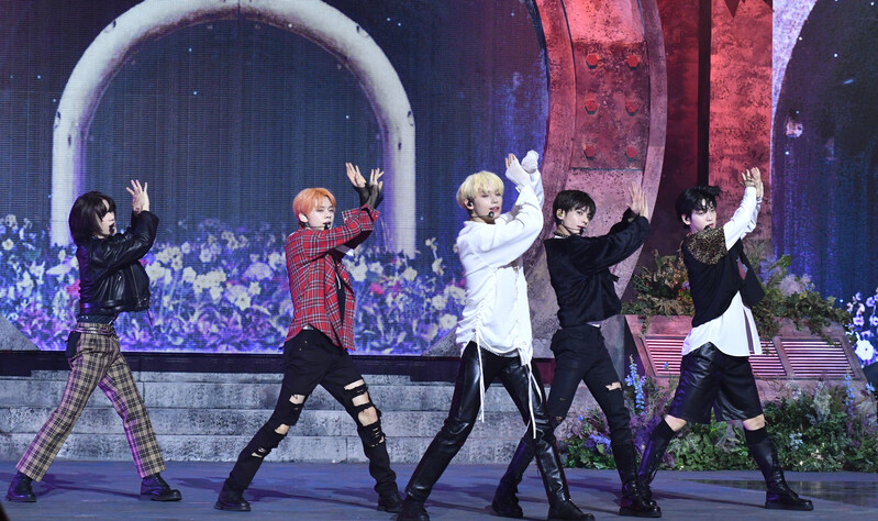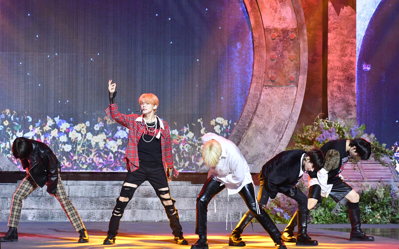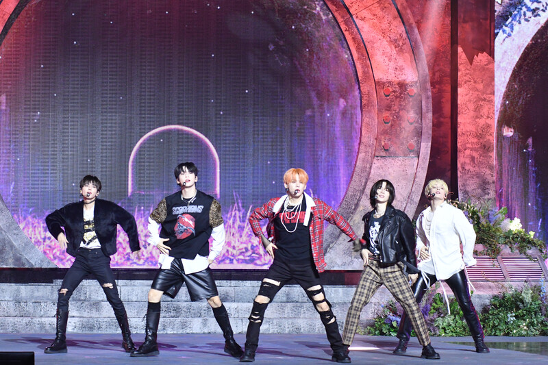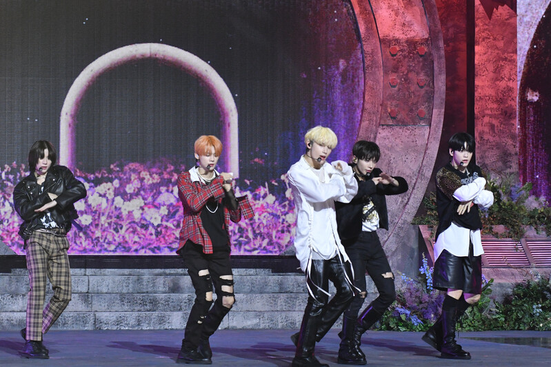 These photos taken during the media showcase of K-pop boy group TXT's third full length album 'The Name Chapter: FREEFALL' show members performing their title track "Chasing That Feeling".