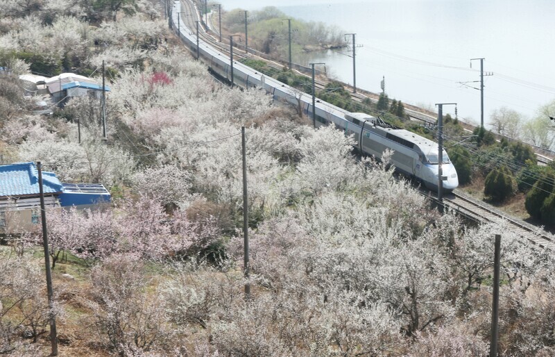 | ▲ A train is passing along the Gyeongbu Line railroad along the Nakdonggang River in Wondong-myeon, Yangsan-si, where plum blossoms are in full bloom. (Yonhap) |