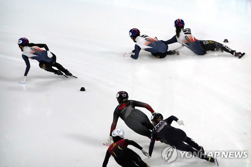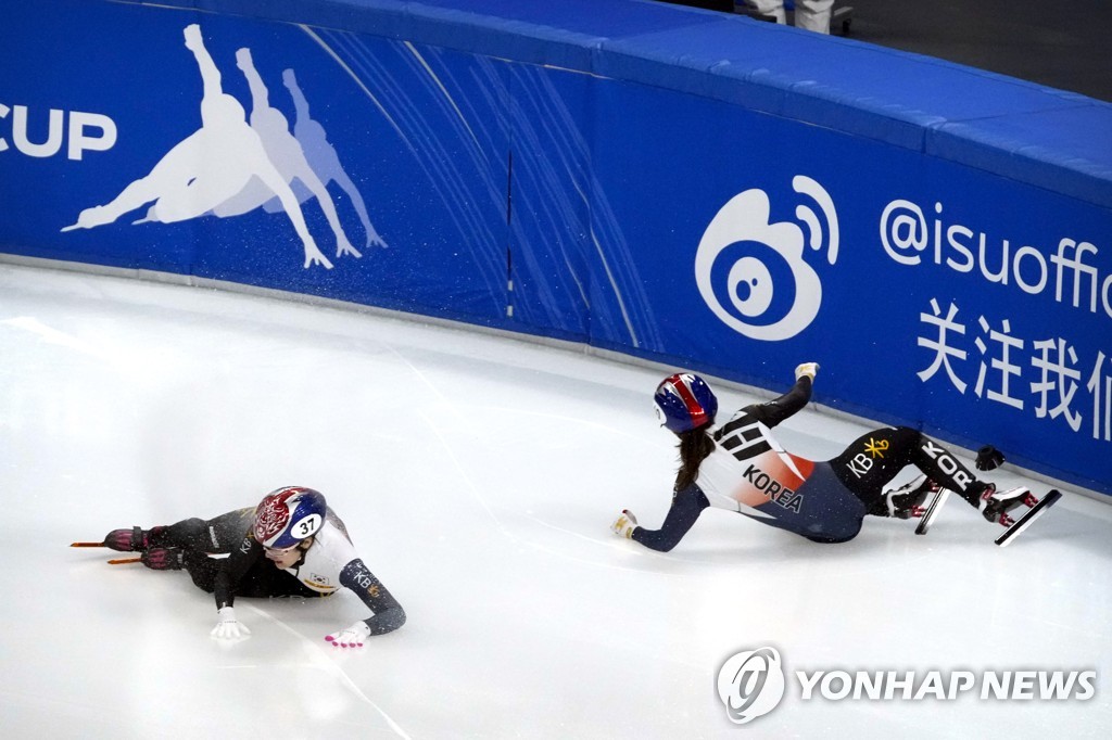| ▲ 충돌해서 넘어지는 최민정과 김지유 쇼트트랙 대표팀 최민정(오른쪽)과 김지유가 23일 중국 베이징 캐피털 실내경기장에서 열린 2021-2022 국제빙상경기연맹(ISU) 쇼트트랙 월드컵 1차 대회 여자 1,500m 결승에서 충돌해 넘어지고 있다. [AP=연합뉴스] |
