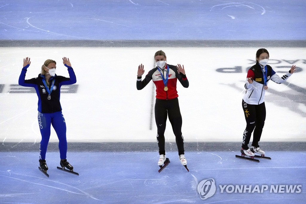 | ▲ 동메달 획득한 최민정(오른쪽) 쇼트트랙 간판 최민정(오른쪽)이 23일 중국 베이징 캐피털 실내경기장에서 열린 2021-2022 국제빙상경기연맹(ISU) 쇼트트랙 월드컵 1차 대회 여자 500m에서 동메달을 목에 건 뒤 손을 흔들고 있다. [AP=연합뉴스] |