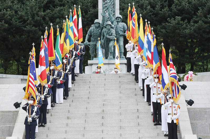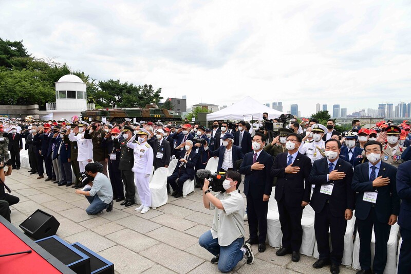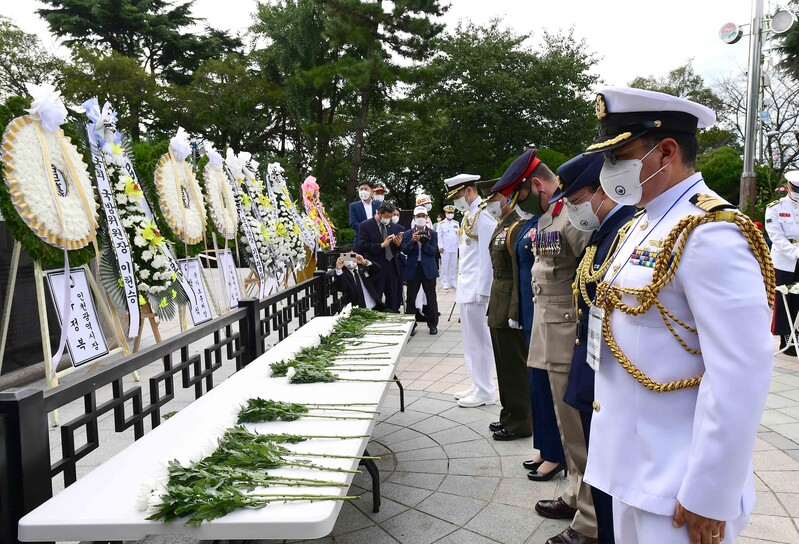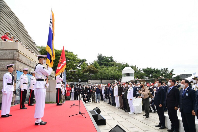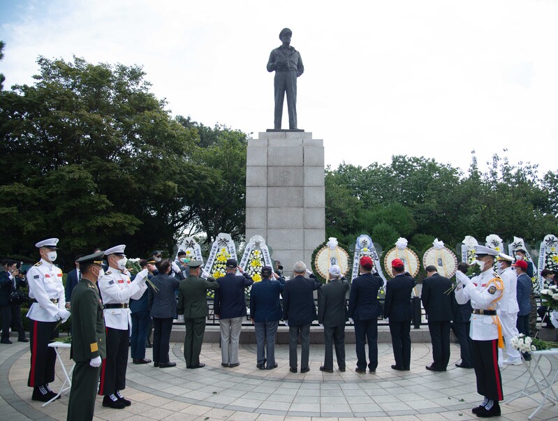 The mayor of Incheon and other participants pay tribute in front of the statue of the late U.S. Gen. Douglas MacArthur at Freedom Park in Incheon, 27 kilometers west of Seoul, on Sept. 15, 2022, the 72nd anniversary of the 1950 Incheon Landing Operation conducted by a MacArthur-led U.N. coalition that turned the tide of the 1950-53 Korean War. The Navy provided this photo. (PHOTO NOT FOR SALE) (Yonhap)