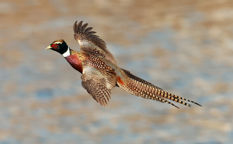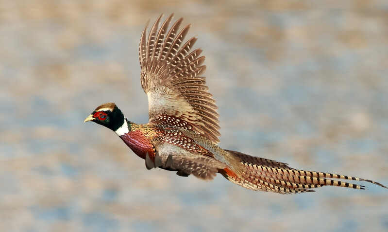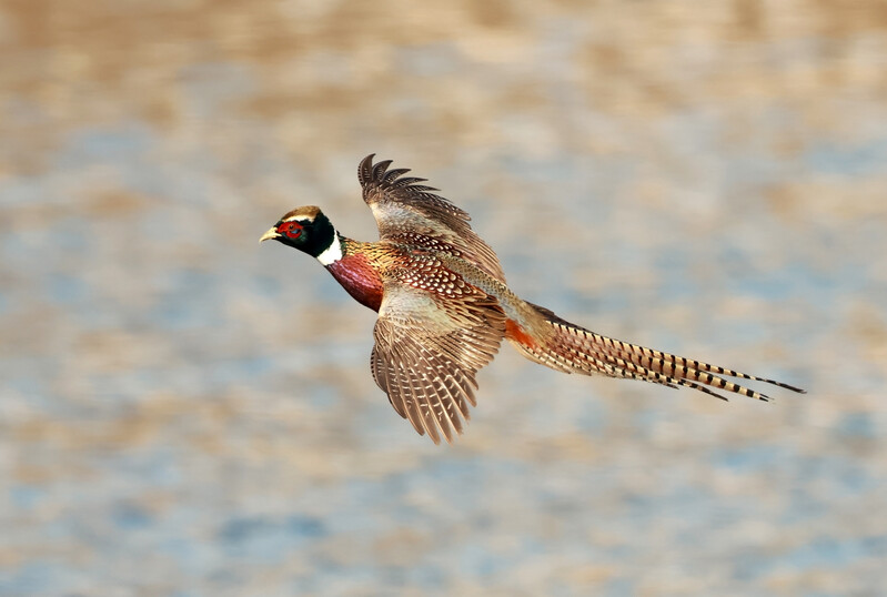 A ring-necked pheasant flies over Namdaecheon Stream in Gangneung, Gangwon-do.