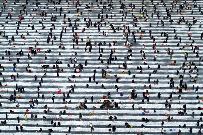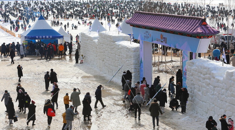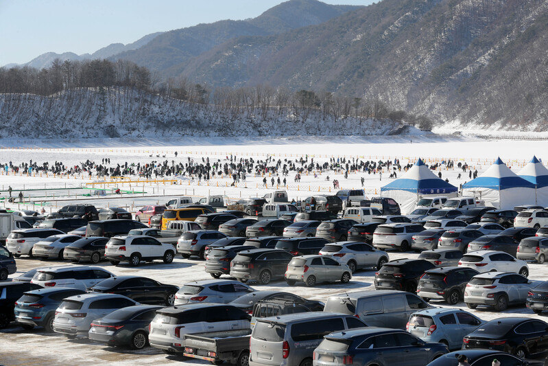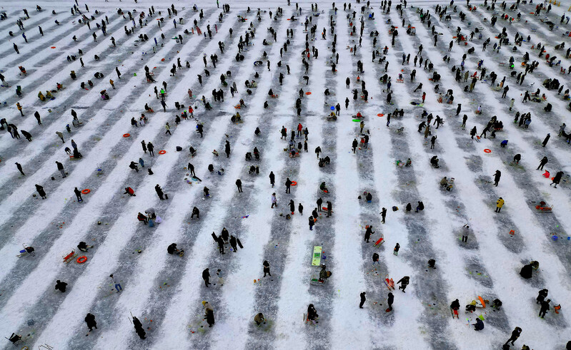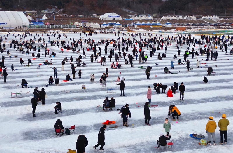 Visitors fish for smelt at an icefish fest held in the northeastern county of Inje, Gangwon Province, on Jan. 22, 2023, in this photo provided by the county office. (PHOTO NOT FOR SALE) (Yonhap)
