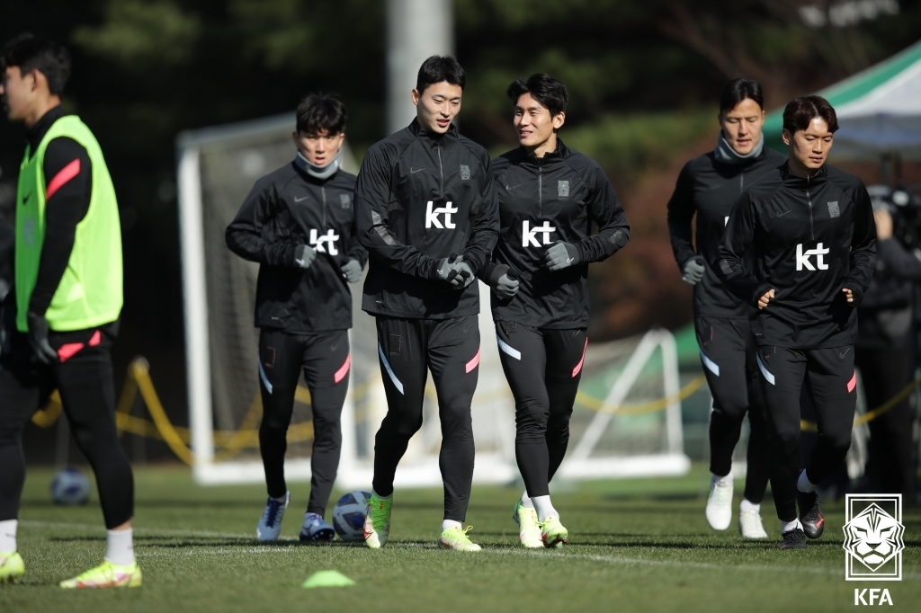 | ▲ 13일 파주 NFC에서 훈련하는 황인범, 조규성, 이용(왼쪽부터) 등 축구 대표팀 선수 [대한축구협회 제공. 재판매 및 DB 금지] |