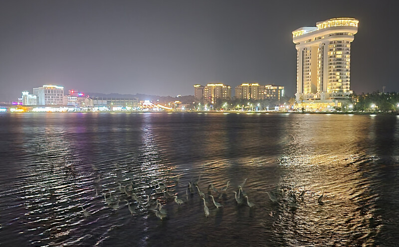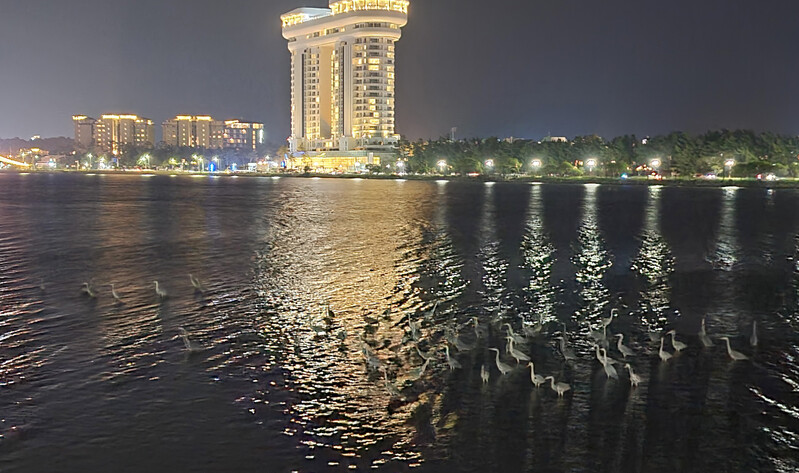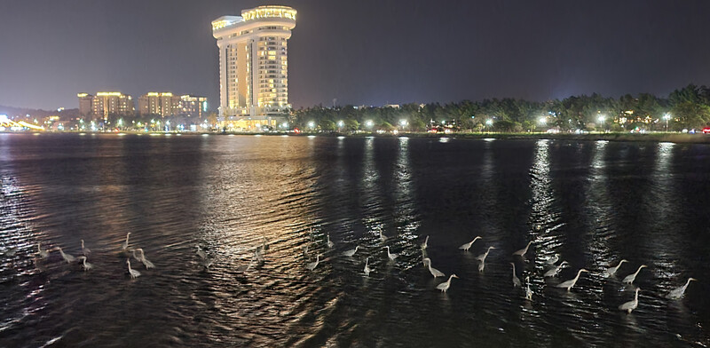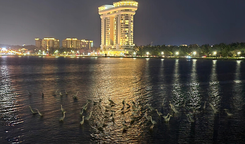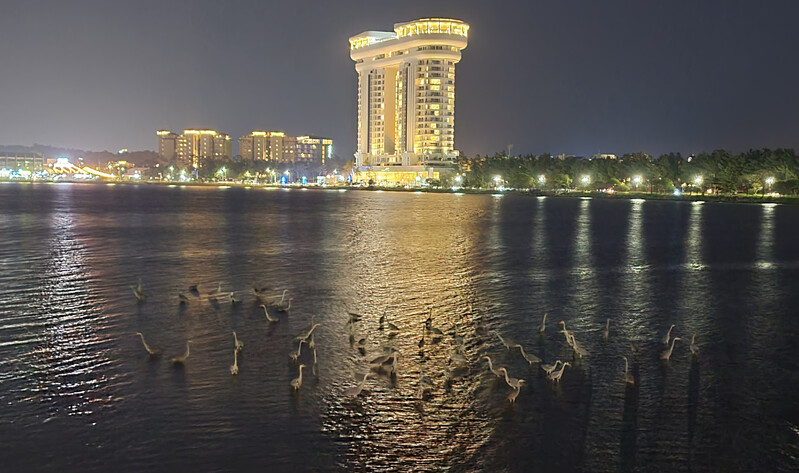 On the night of the 26th, a flock of grey herons are waiting to hunt for fish coming up from the sea at the mouth of Gyeongpo Lake in Gangneung, Gangwon Province.