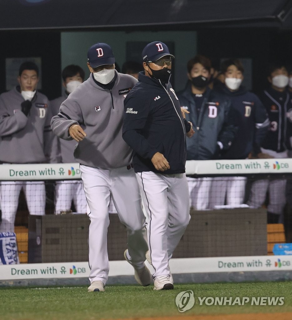 이때 김태형 두산 감독이 강석천 수석코치의 만류를 뿌리치고 더그아웃에서 나와 이영재 주심에게 다가갔다.