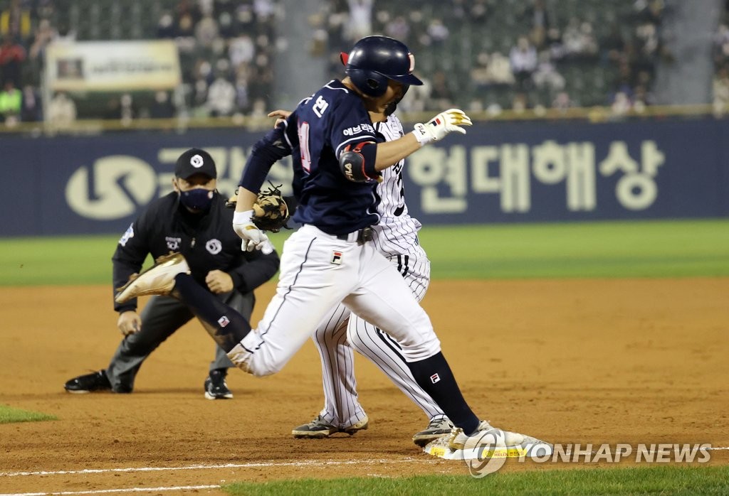 | ▲ 두산 정수빈 '힘차게 뛰었지만' (서울=연합뉴스) 김인철 기자 = 4일 서울 송파구 잠실야구장에서 열린 2021 프로야구 KBO 포스트시즌 준플레이오프 1차전 두산 베어스와 LG 트윈스의 경기. 5회초 무사 1루 두산 정수빈이 기습 번트 후 1루로 질주하고 있다. 정수빈은 비디오 판독 결과 아웃 처리됐다. 2021.11.4 yatoya@yna.co.kr |