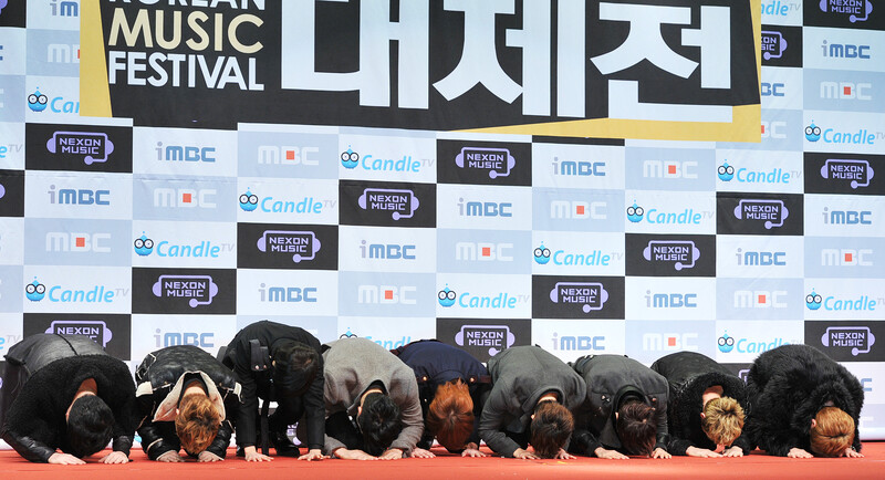 | ▲ This file photo shows K-pop boy group Super Junior taking Sebae in "2011 MBC Gayo Daejejeon." (Yonhap) |