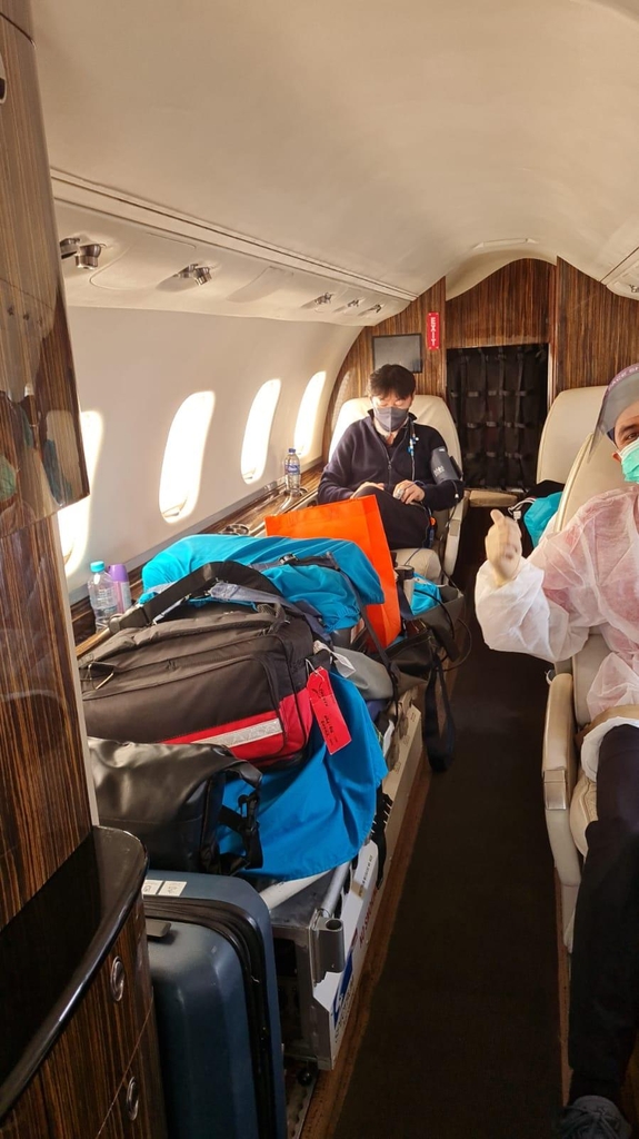 그는 코로나19 감염에서 회복해 26일 검사 결과 음성 판정을 받아 일반 여객기에 탈 수 있지만, 건강 상태상 높은 고도에서 문제가 생길 수 있다고 보고 자비 약 1억3천만원을 들여 에어앰뷸런스를 대절했다.