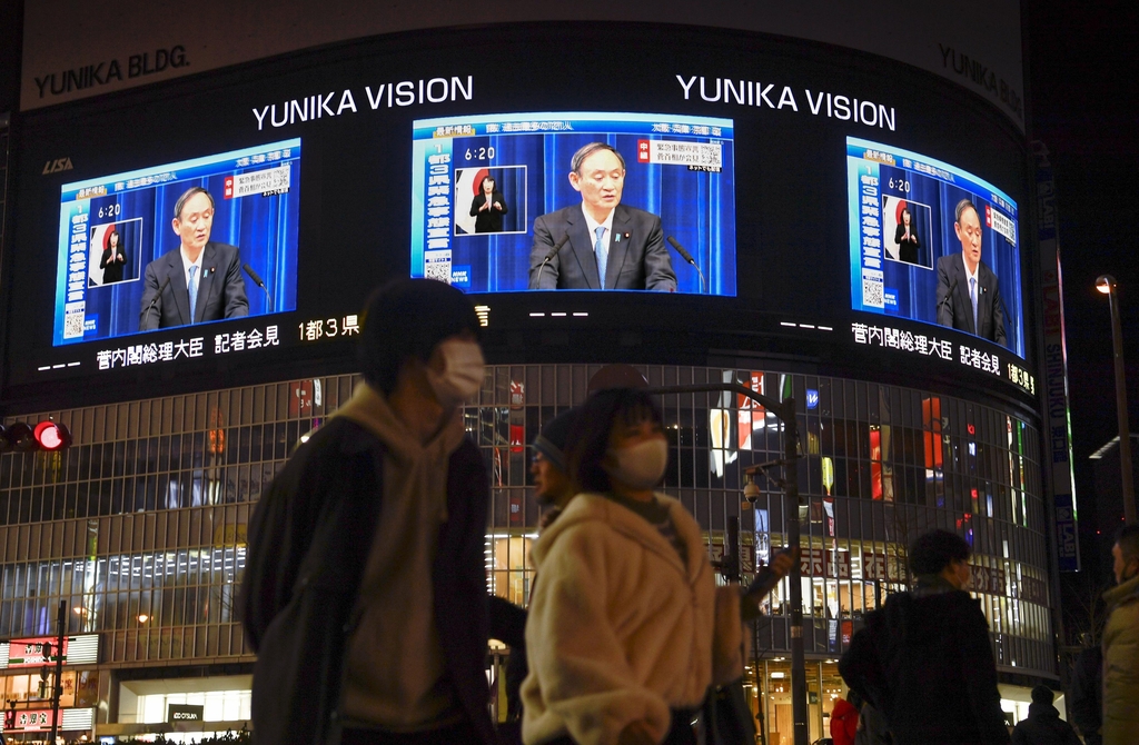 | ▲ (도쿄 교도=연합뉴스) 지난달 7일 스가 요시히데(菅義偉) 일본 총리가 도쿄 등 수도권 일부 지역에 긴급사태를 재발령한다는 취지의 기자회견을 하는 장면이 도쿄 신주쿠(新宿)구에 설치된 대형 스크린에 중계되고 있다. |