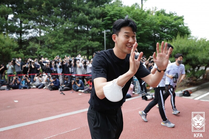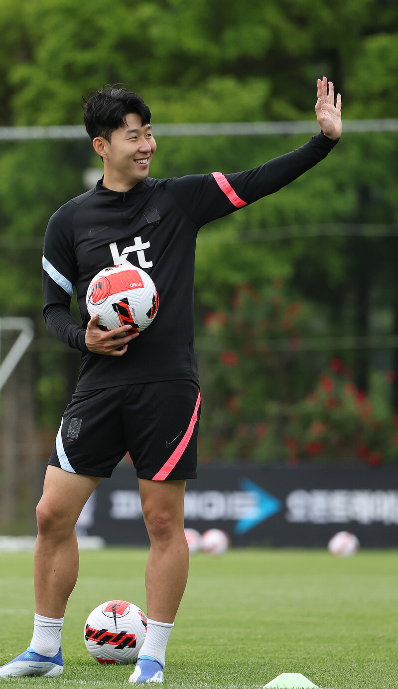 Son Heung-min, captain of the South Korean men's national football team, waves to fans during an opening training session at the National Football Center in Paju, Gyeonggi Province, on May 30, 2022. (Yonhap)