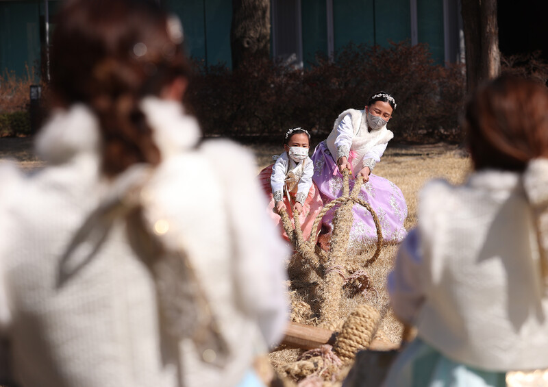 In Andong, Gyeongsangbuk-do, many women played a traditional game where they bend at the waist, grab the waist of the person in front of them, and a woman who plays the role of a princess steps on people’s back and run along with the help of a woman who plays a maid.