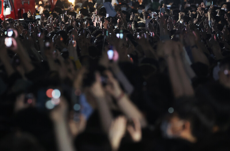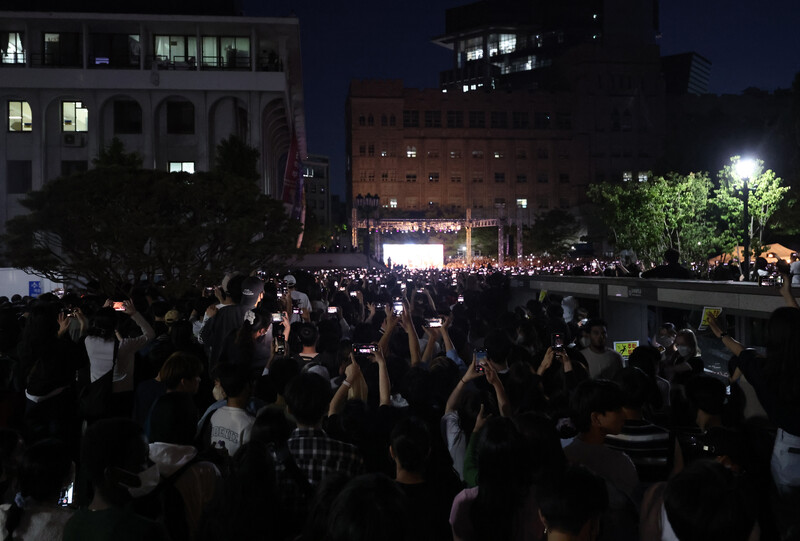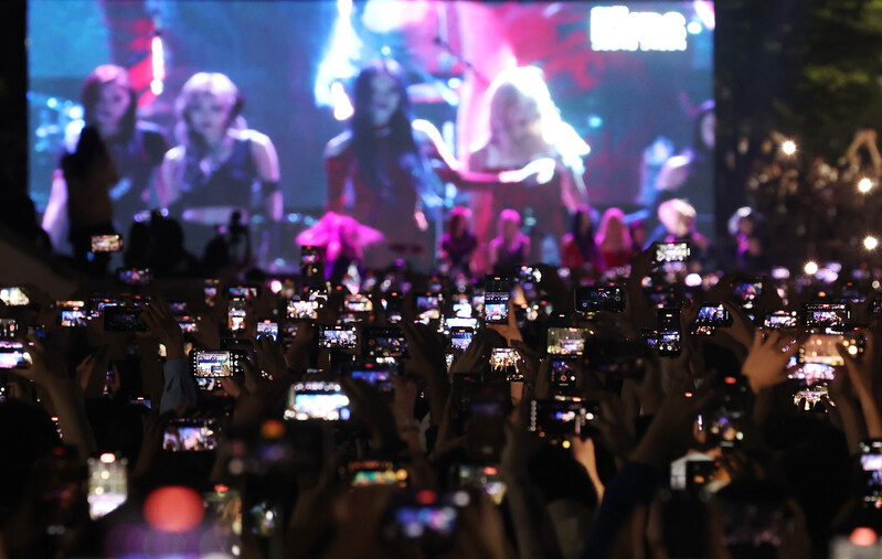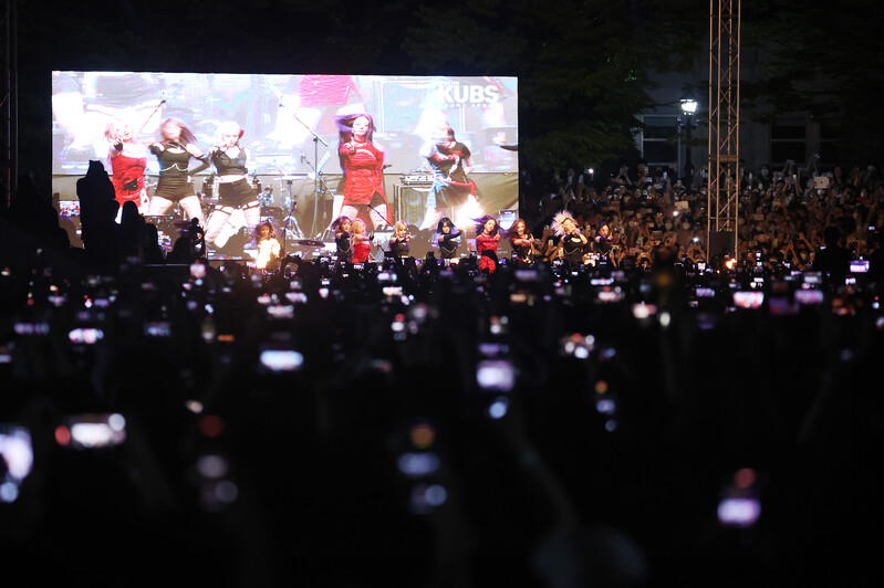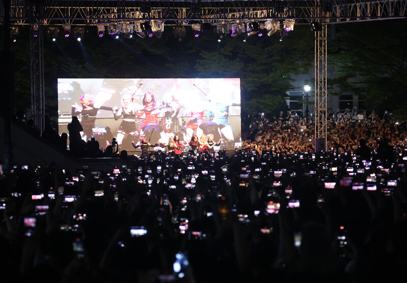 Girl group Aespa performs to a packed audience during a festival at Korea University in Seoul on May 26, 2022, as social distancing rules against COVID-19 have been drastically eased. (Yonhap)