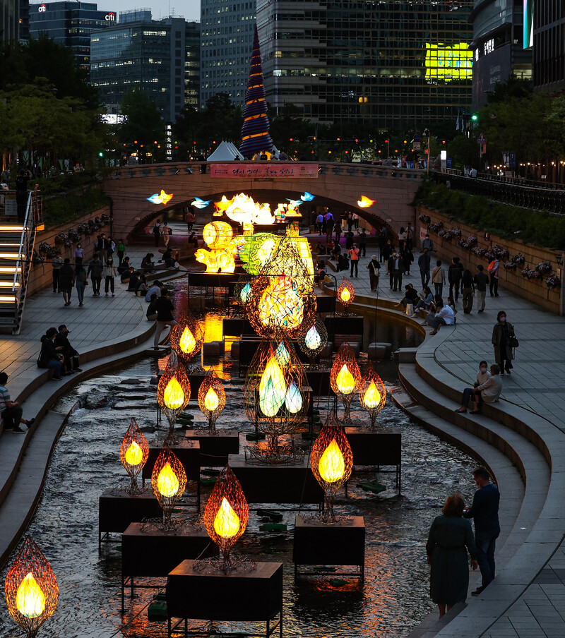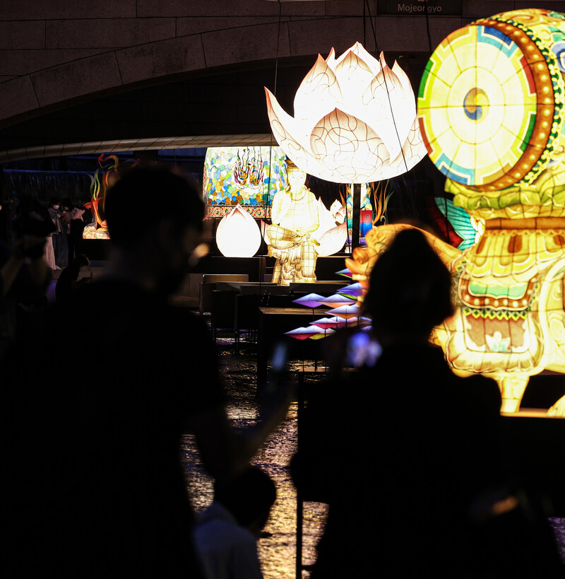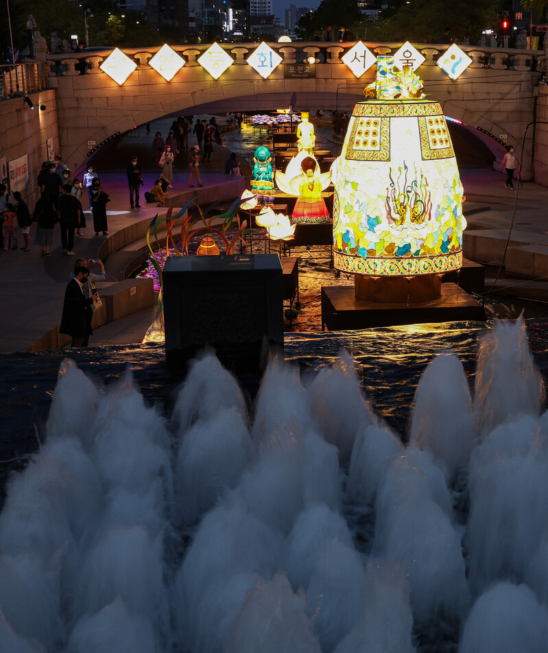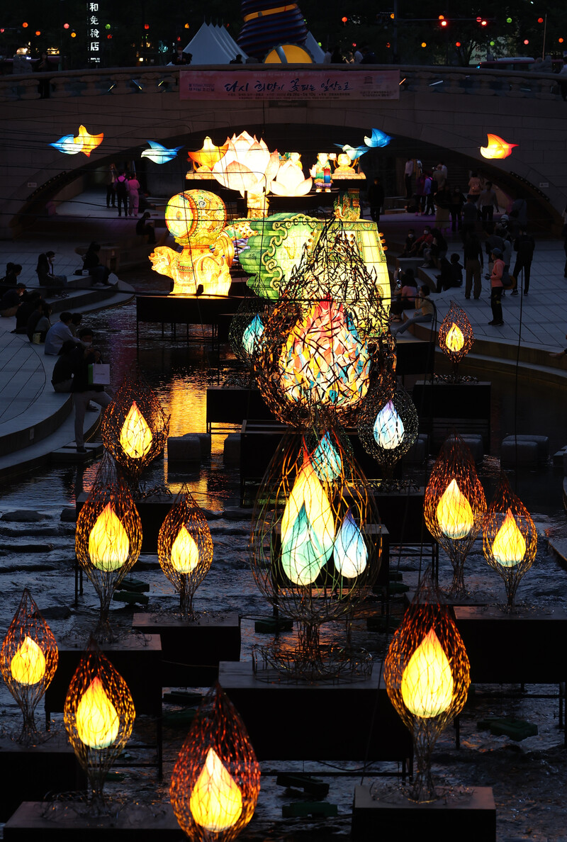 Colorful lotus lanterns are lit along Cheonggye Stream in central Seoul on April 26, 2022, ahead of Buddha's Birthday, which falls on May 8. (Yonhap)