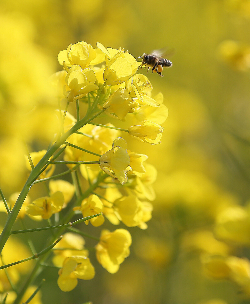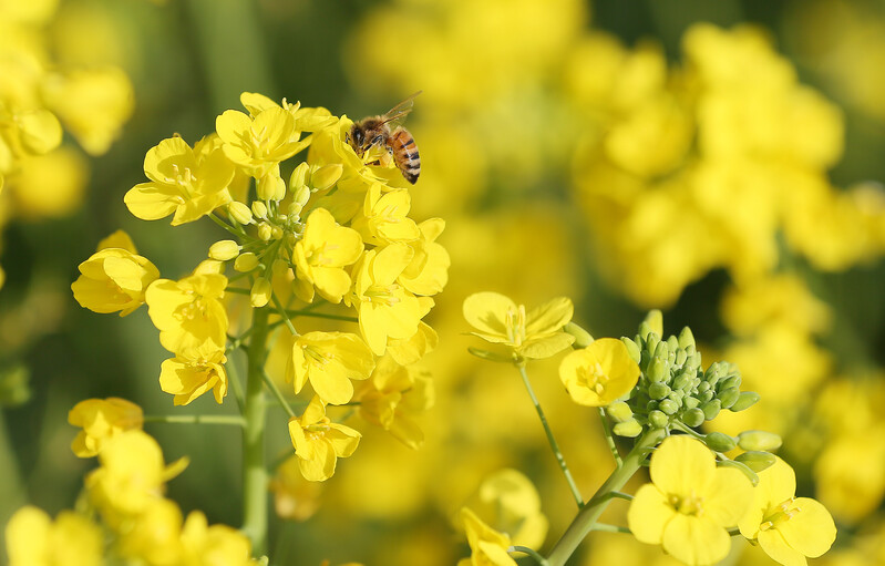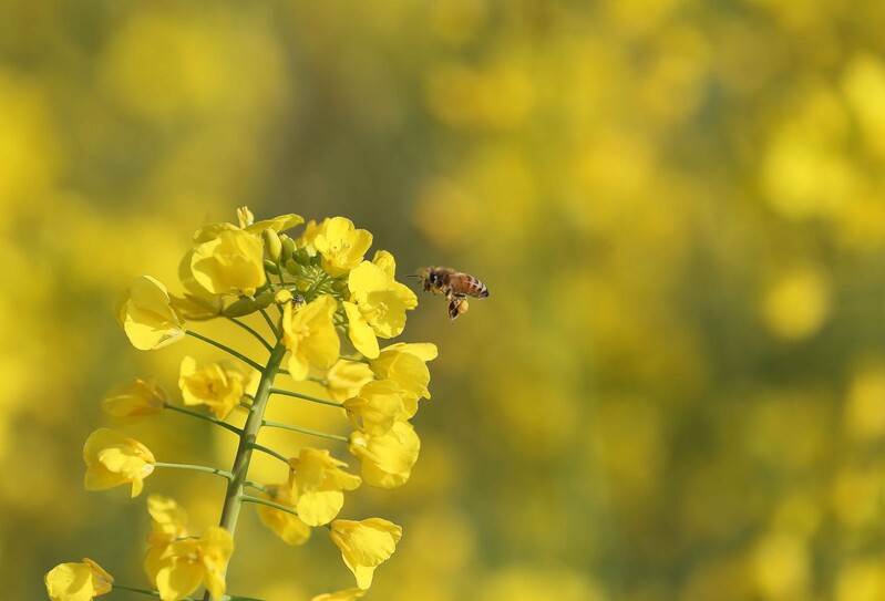 A honeybee is collecting honey in a field of rape flowers in full bloom around the coast of Yongdam-dong on Jeju Island on March 12, 2022. (Yonhap)