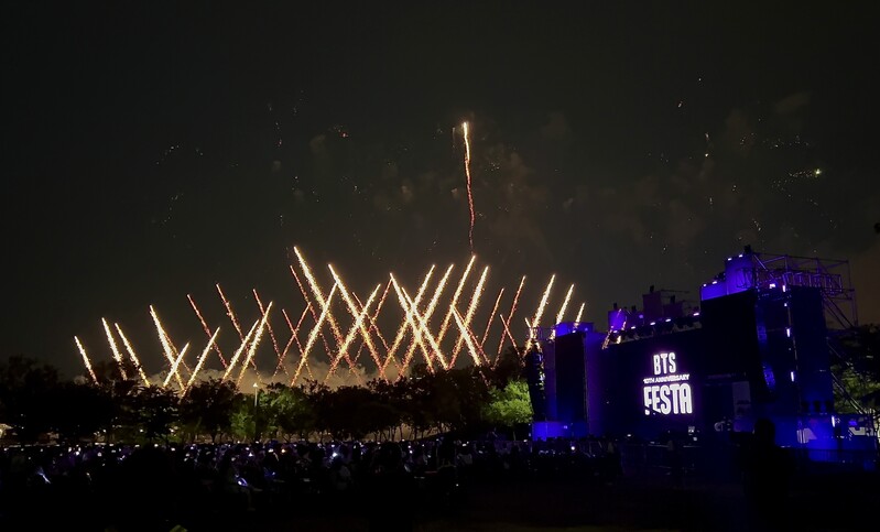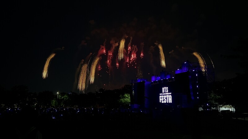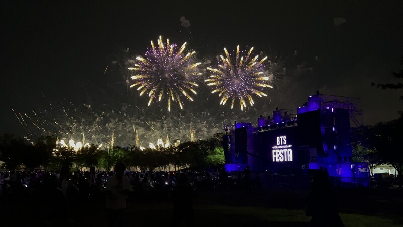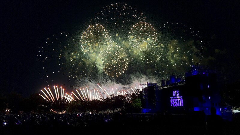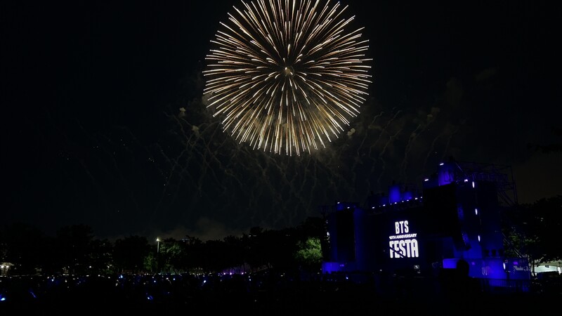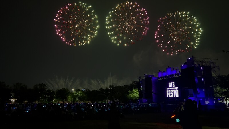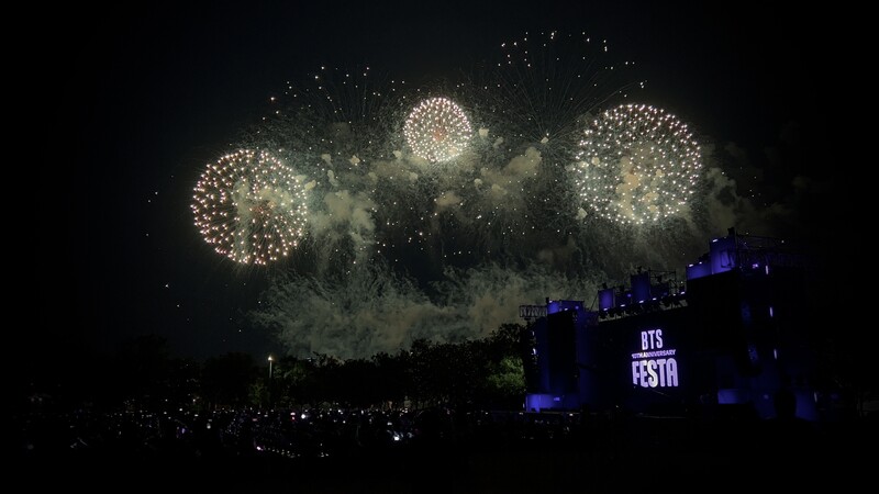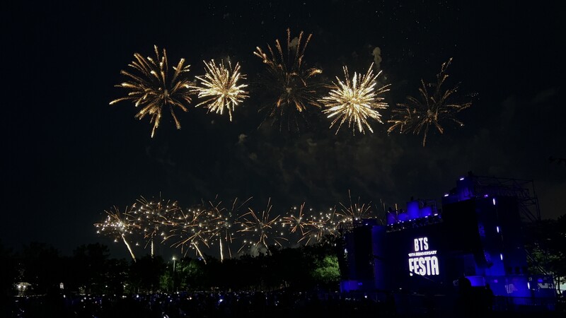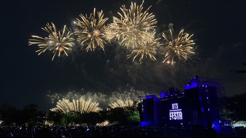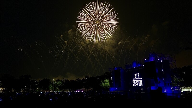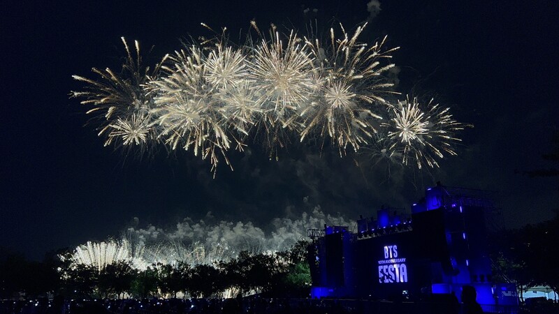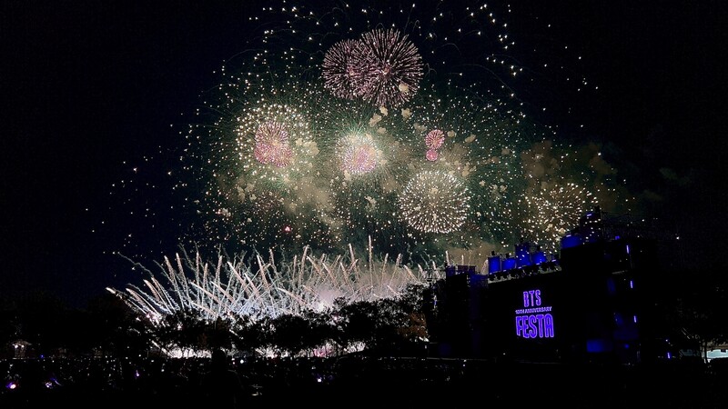 These photos taken during the "2023 BTS FESTA" show amazing fireworks lighting up the sky to celebrate BTS' 10th anniversary.