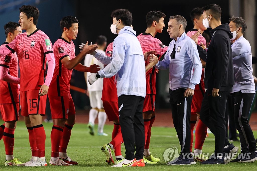 | ▲ 선수들 격려하는 벤투 감독 (안산=연합뉴스) 류영석 기자 = 7일 오후 경기도 안산 와스타디움에서 열린 2022 카타르월드컵 아시아최종예선 A조 3차전 대한민국 대 시리아의 경기. 파울루 벤투 감독이 2대1로 승리한 뒤 선수들을 격려하고 있다. 2021.10.7 ondol@yna.co.kr |