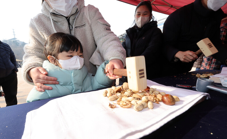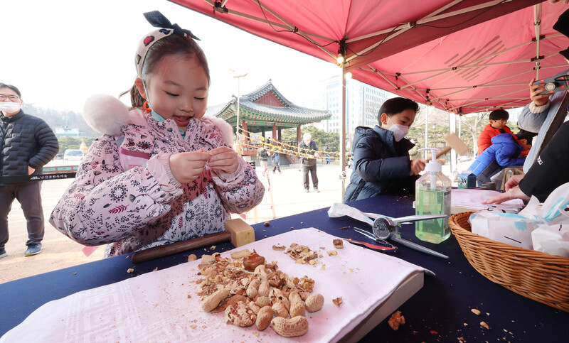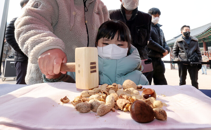 A child cracks open peanuts and walnuts with a wooden hammer at a Jeongwol Daeboreum event held at Namsangol Hanok Village in Seoul to wish for loved ones' good health and fortune.