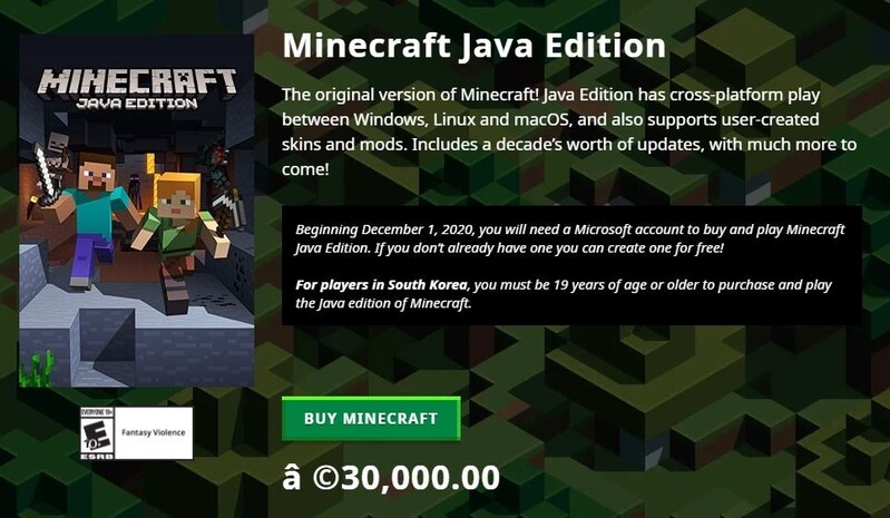 | ▲ This screen capture from Minecraft's website shows age restrictions in South Korea to purchase the Java edition of the game. (PHOTO NOT FOR SALE) (Yonhap) |