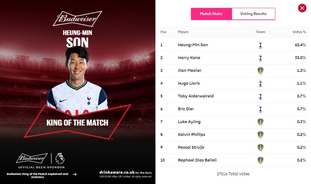 경기가 끝난 뒤 후스코어드닷컴은 손흥민에게 양 팀을 통틀어 가장 높은 평점 8.8을 줬다. 케인도 같은 점수를 받았다.