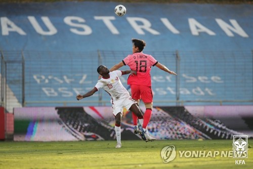 | ▲ 공중볼 다툼하는 원두재 (서울=연합뉴스) 17일 오후 오스트리아 마리아 엔처스도르프의 BSFZ 아레나에서 열린 한국과 카타르의 축구대표팀 평가전. 원두재가 공중볼 다툼을 하고 있다. 2020.11.17 [대한축구협회 제공, 재판매 및 DB 금지] photo@yna.co.kr |