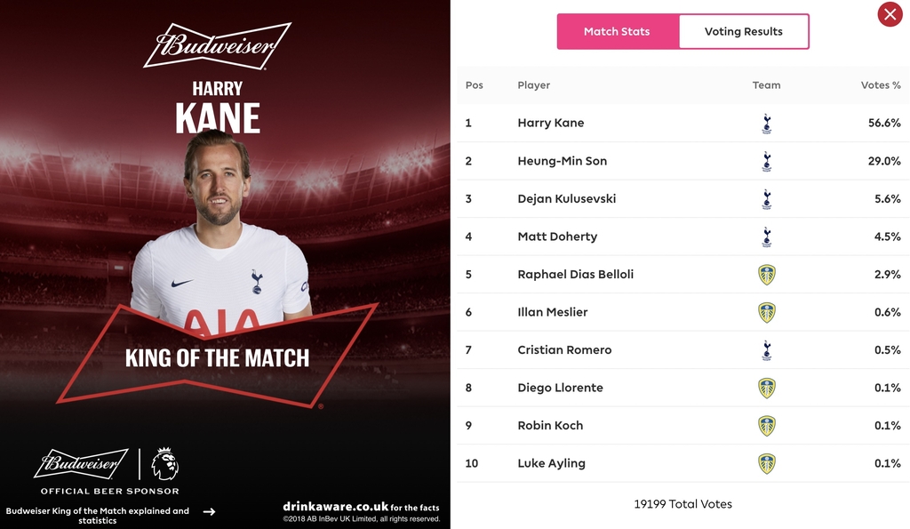 경기 MVP 격인 '킹 오브 더 매치' 팬 투표에서 케인은 56.6%의 득표율을 보여 수상자로 선정됐다.