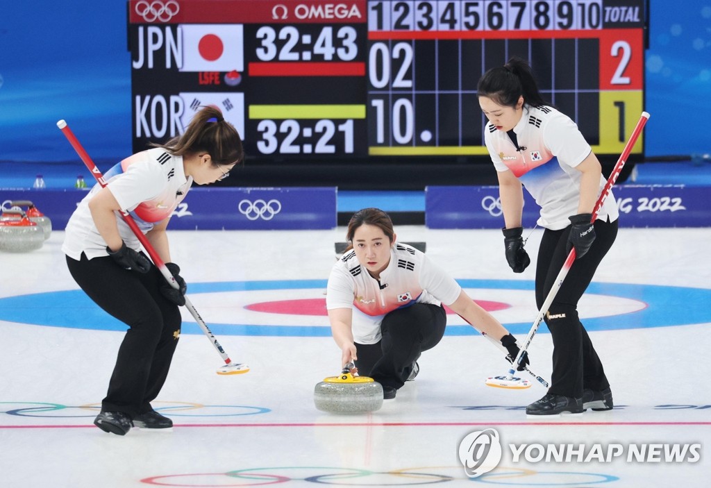 BEIJING, Feb. 14 (Yonhap) -- South Korea got a split of its Olympic women's curling double header Monday, losing to the United States in the morning but then beating Japan to keep its medal hopes alive in Beijing.