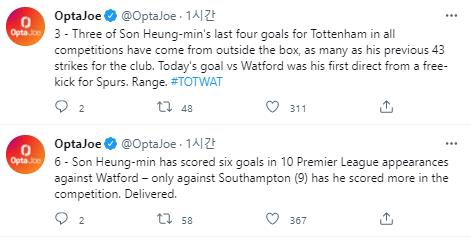 아울러 옵타는 이 골로 손흥민이 토트넘 유니폼을 입은 이후 직접 프리킥으로는 첫 골을 넣었다고도 전했다.