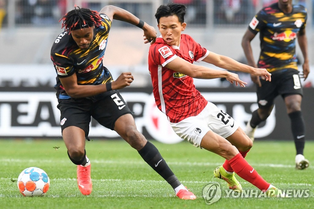 | ▲ 라이프치히 모하헤드 시마칸과 경합하는 프라이부르크 정우영(오른쪽) [AFP=연합뉴스] |