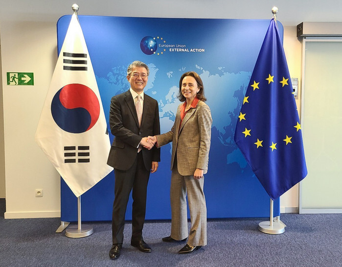 South Korea's First Vice Foreign Minister Kim Hong-kyun (L) poses for a photo with European External Action Service Secretary General Belen Martinez Carbonell during their meeting in Brussels on March 18, 2025, in this photo released by the South Korean foreign ministry. (PHOTO NOT FOR SALE) (Yonhap)